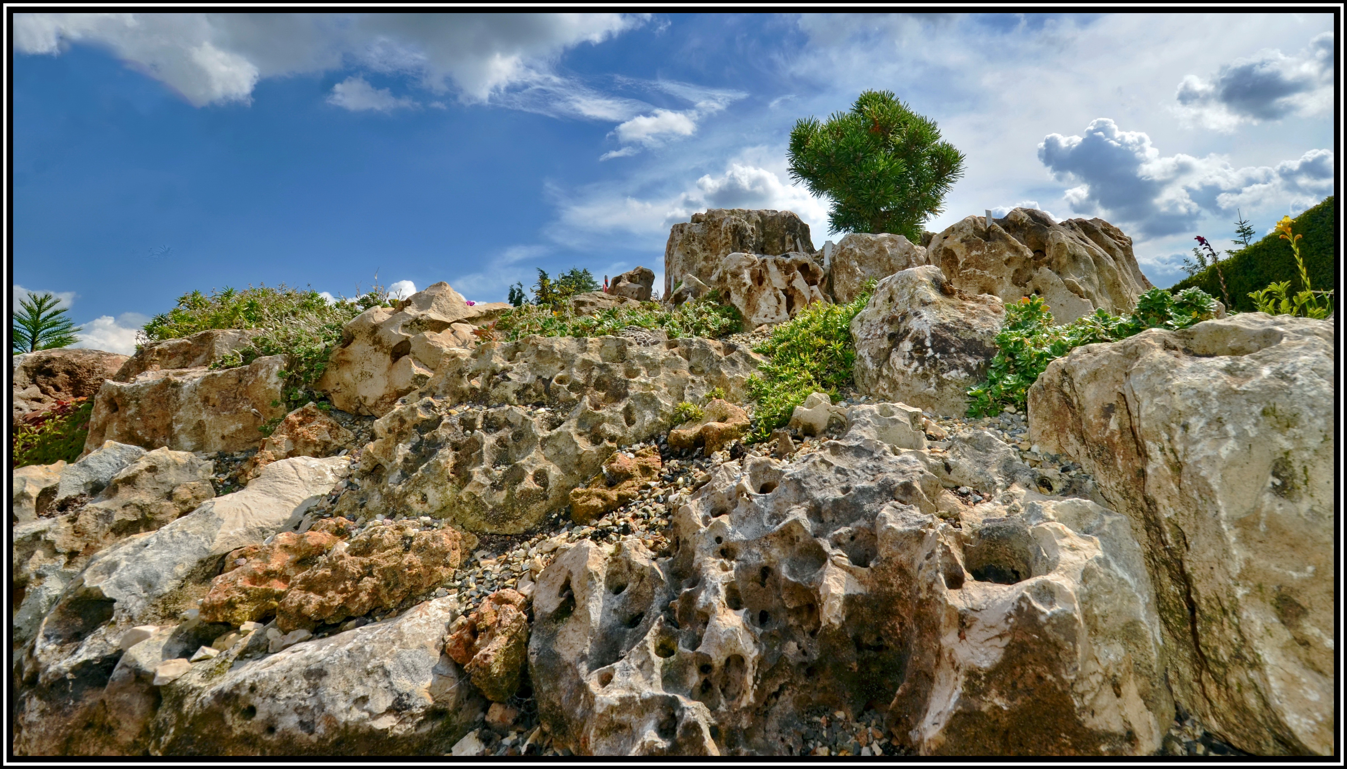 Das Alpinum (8/34) Das ist die Nordseite des Alpinums und außerdem die Seite, an der die letzten noch übrigen Steine verbaut wurden. Die Mädchenkiefer, ein Hexenbesen, wächst auf der höchsten Erhebung des kleinen Gebirges, das an dieser Stelle 85 Zentimeter misst.