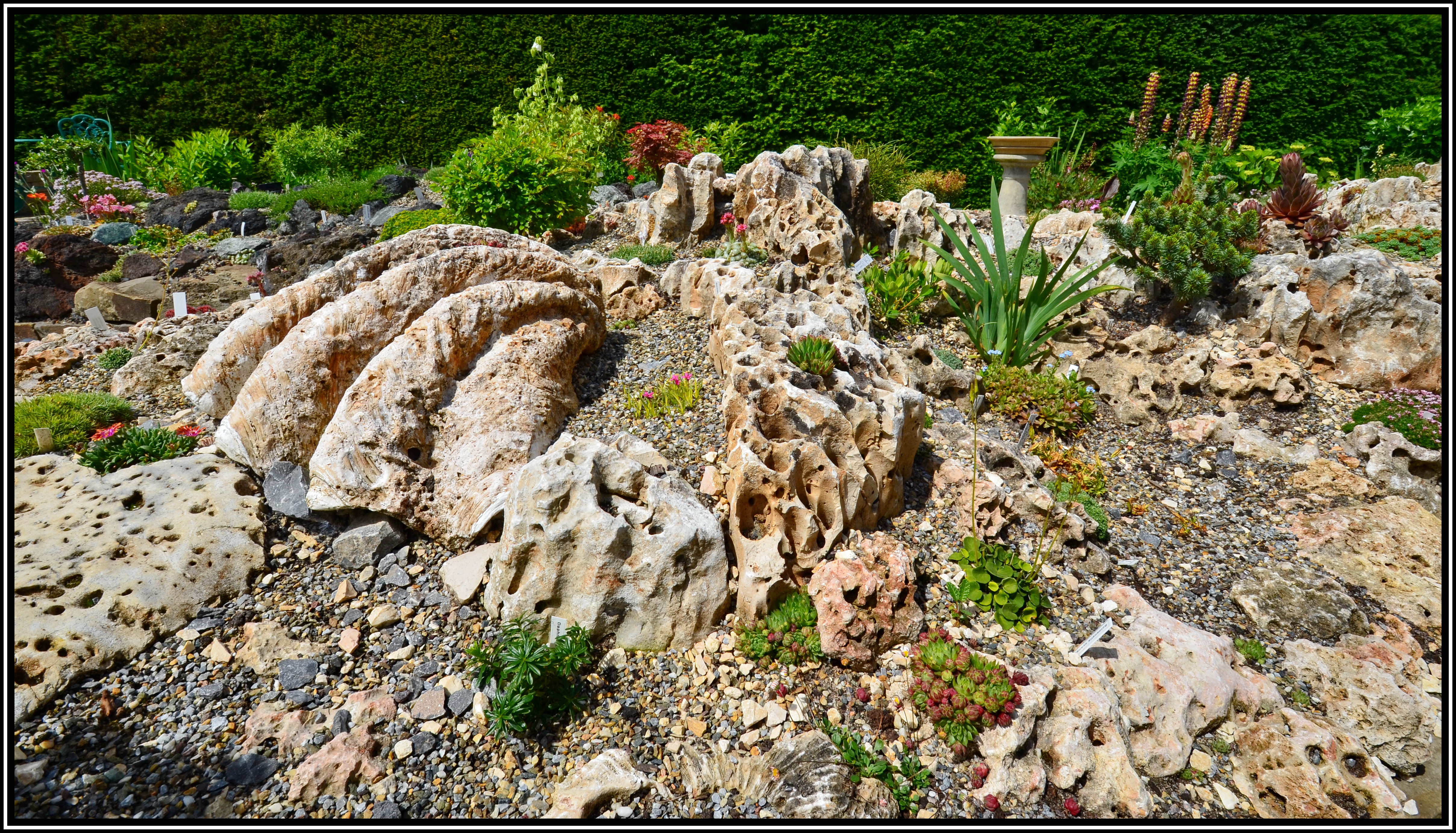 Das Alpinum (14/34) Unter der großen Muschel überwintern gerne mal Waldmäuse. Vielleicht muß sie deshalb noch mit Schotter unterfüllt werden.