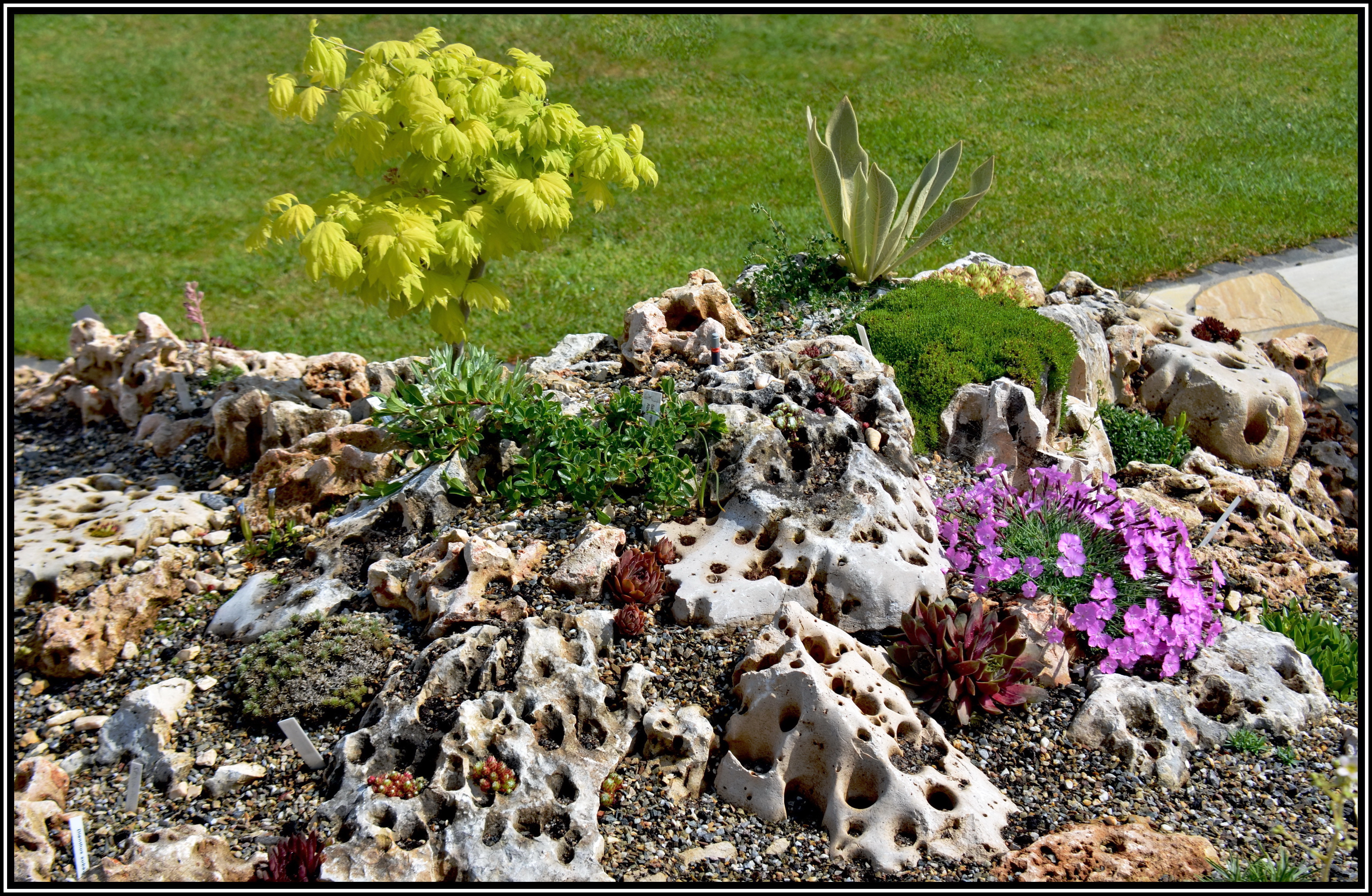 Das Alpinum (17/34) Viele der Gesteinsbrocken sind unregelmäßig geformt. Wichtig ist, sie so zu positionieren, daß man jedem einzelnen sicher betreten kann, ohne daß sich was bewegt. Mitunter hilft da ein Meißel oder aber etwas Mörtel.