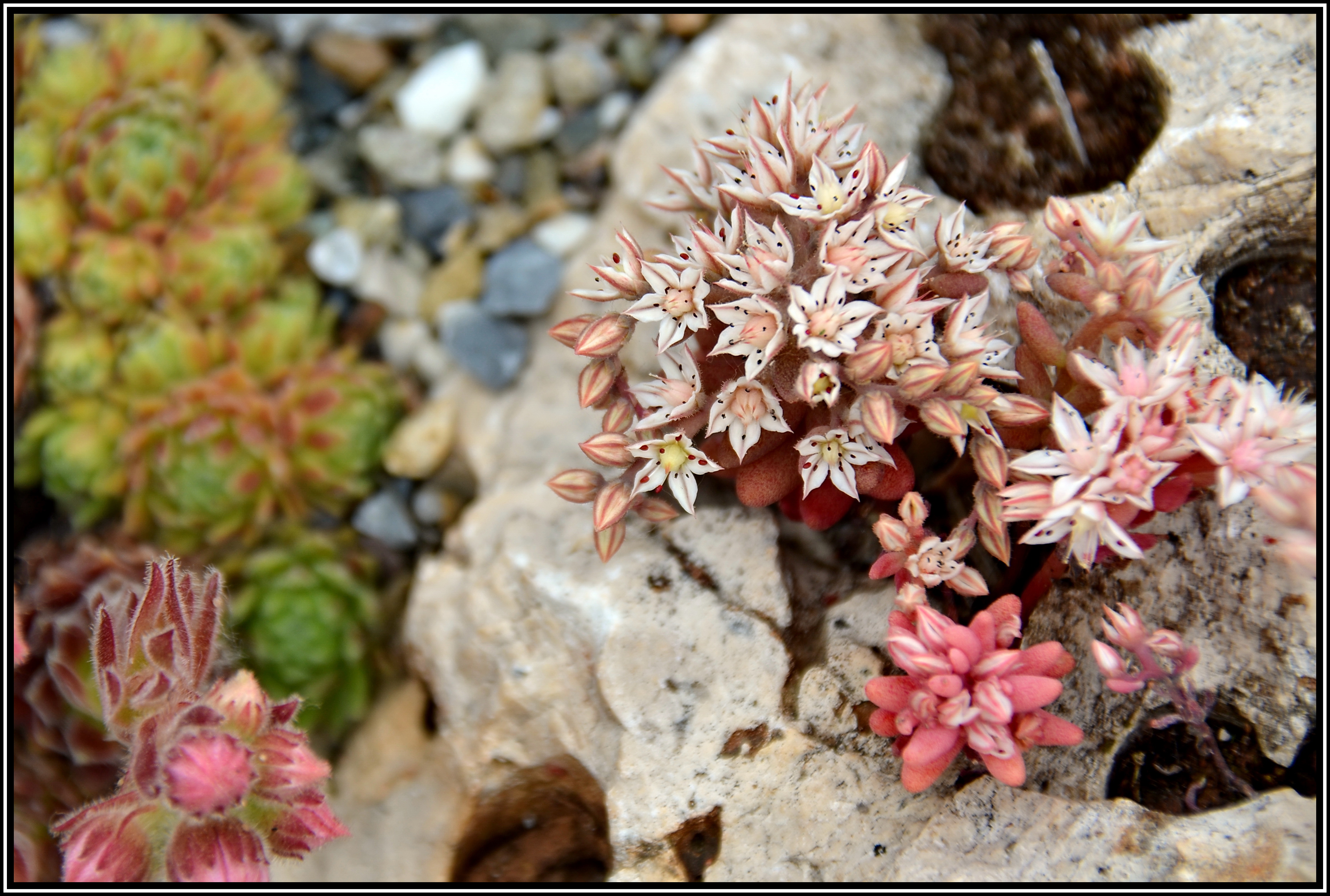 Das Alpinum (21/34) Im porösen Kalktuff, den wir aus Italien geliefert bekamen, befanden sich verschiedenste Samen, so auch dieses einjährige Sedum.