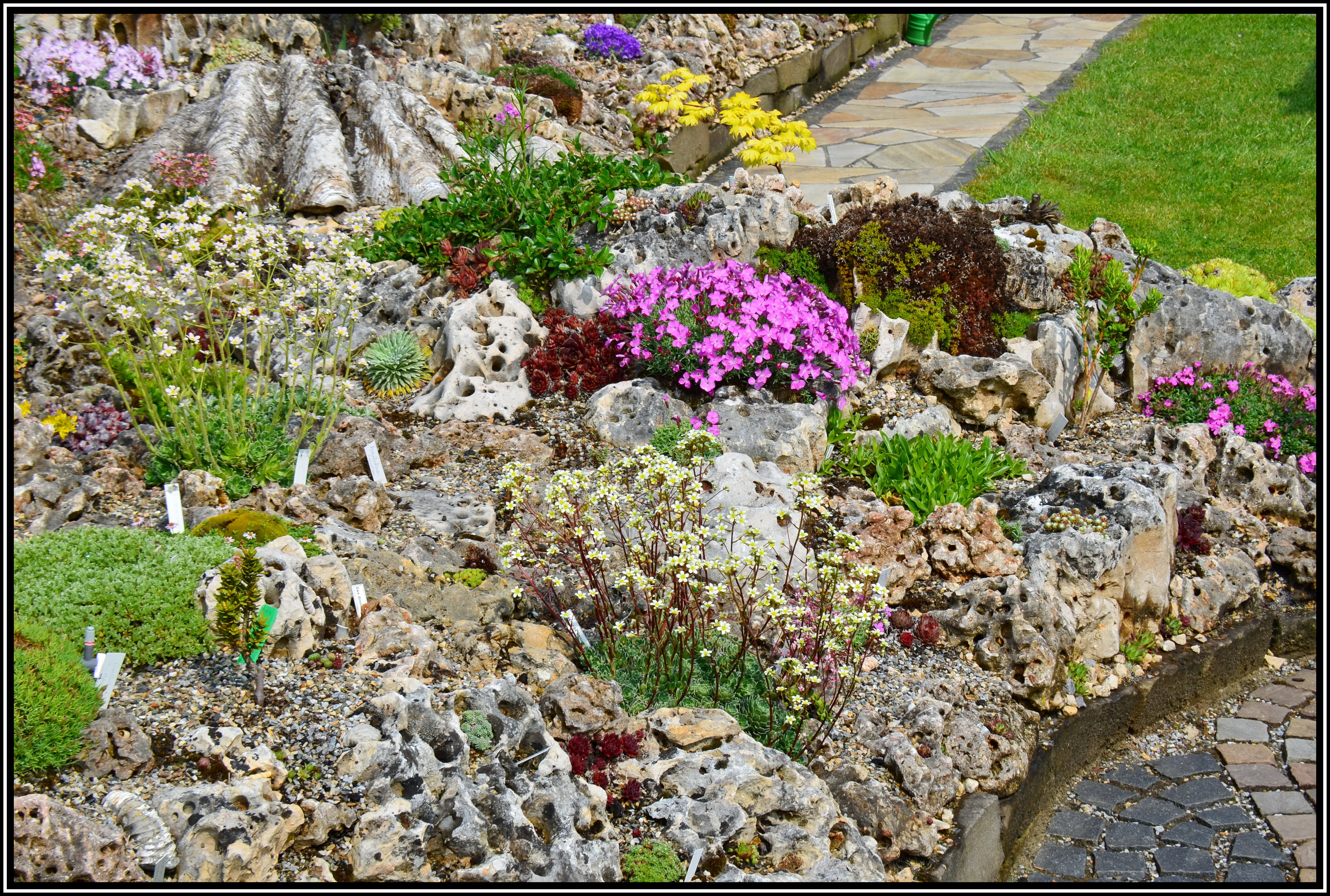 Das Alpinum (29/34) Im Mai und Juni dominieren die Nelken und die Rispen-Steinbrech-Polster die Anlage.