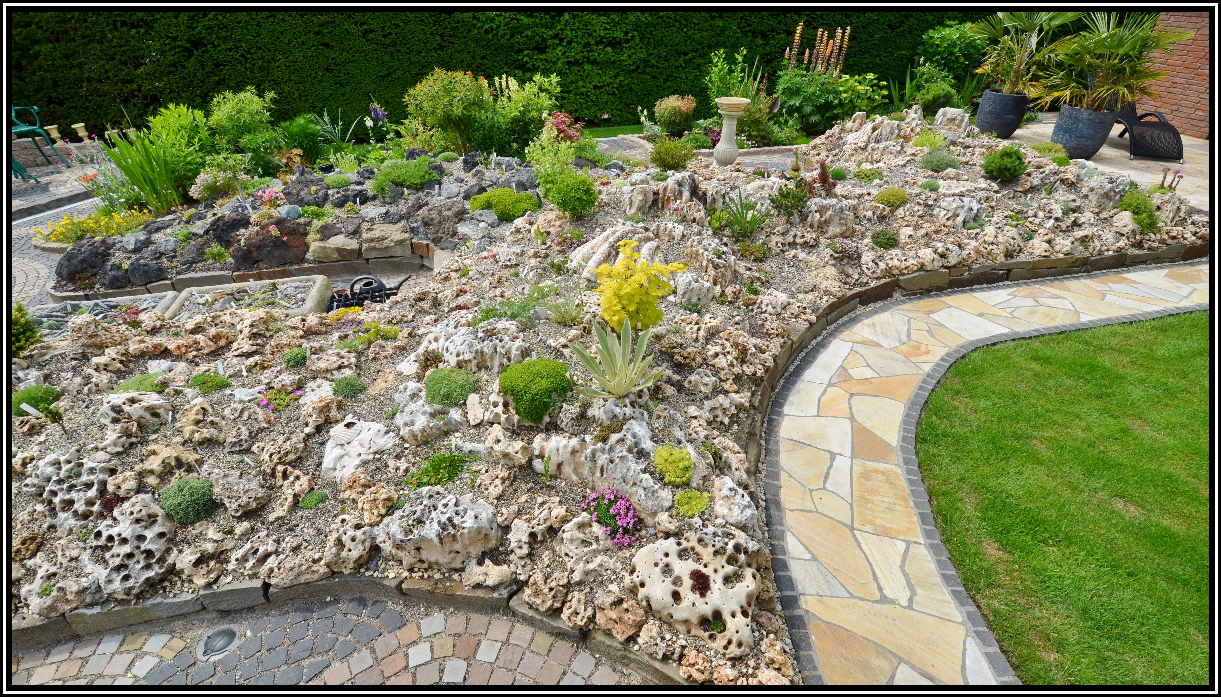 Nach zwei Jahren sieht der große Steinhaufen immernoch aus wie ein großer Steinhaufen. Tatsächlich dauert es ziemlich lange, bis die Pflänzchen sich etabliert haben. Natürlich weiß ich, daß so ein Alpinum erst nach zehn bis fünfzehn, oder gar zwanzig Jahren richtig gut aussieht und Fernwirkung hat.