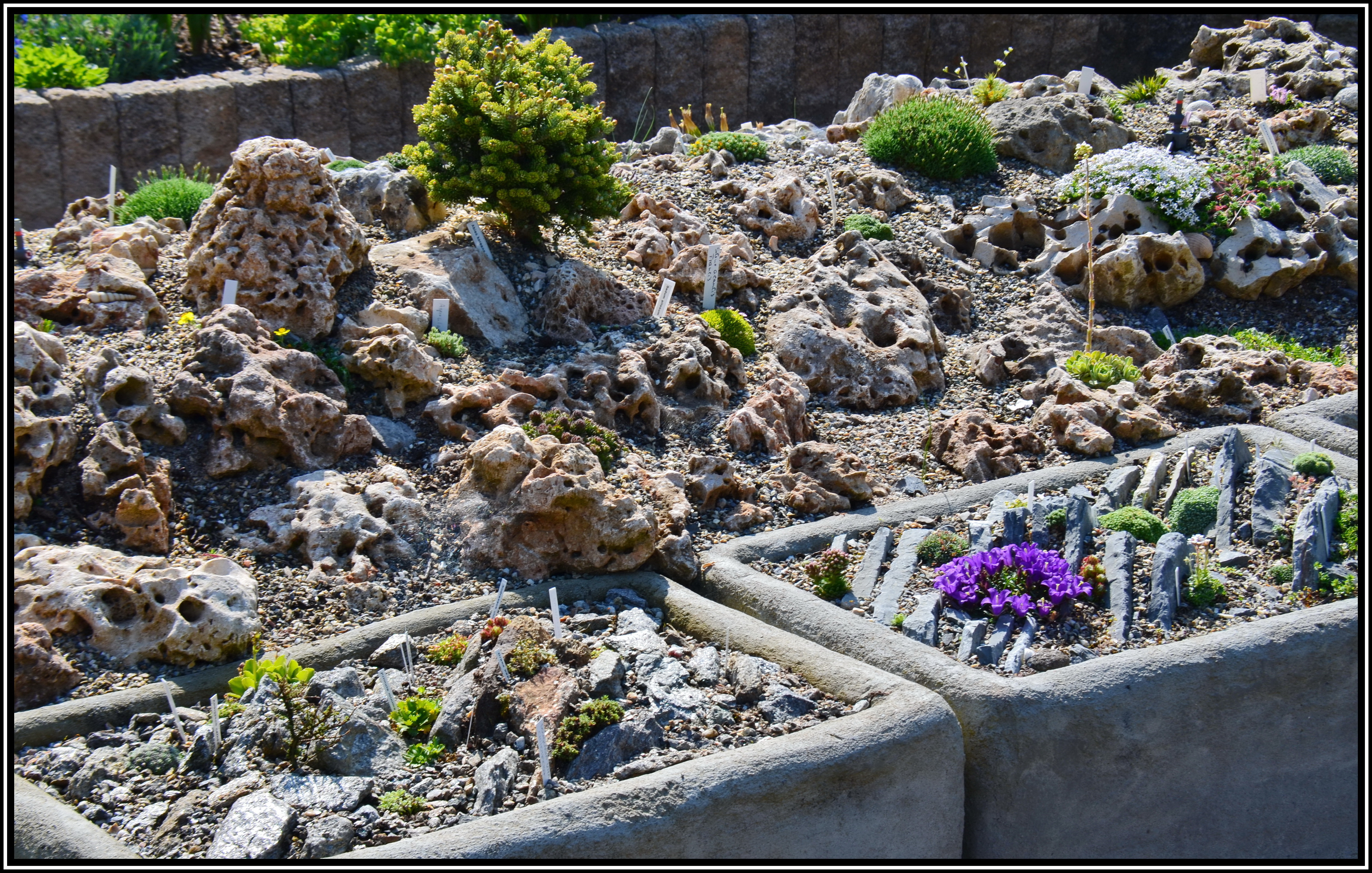 Das Alpinum (6/34) Die Tröge schließen direkt an das Kalktuff-Beet an. Hierin sind die kleinsten Polsterpflänzchen untergebracht.