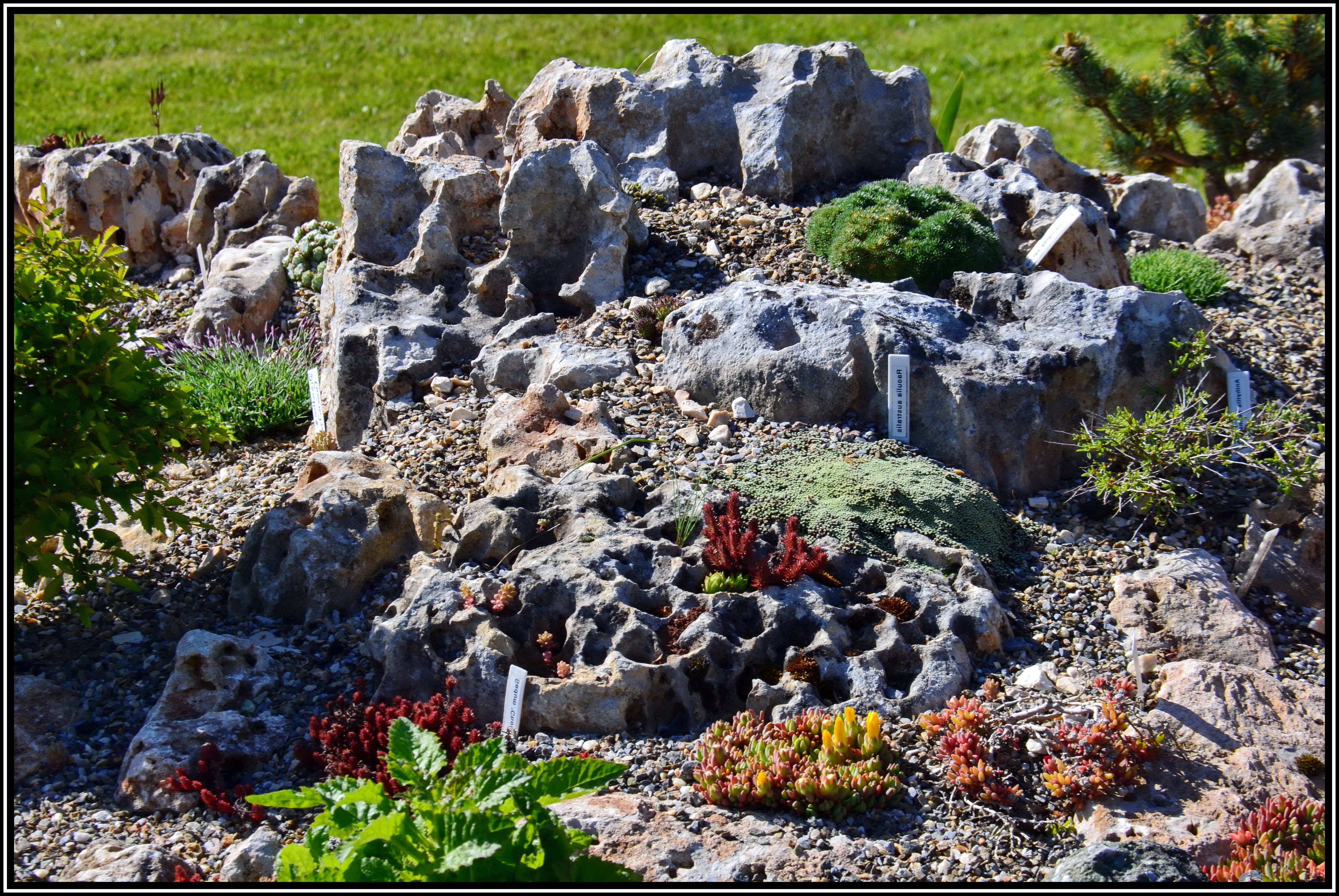 Das Alpinum (7/34) Viele der Kalkstein-Brocken sind länglich geformt mit durchgehender Porung. Sie stehen aufrecht im Beet, dadurch ist der Wasserablauf gesichert und auch die Standfestigkeit.