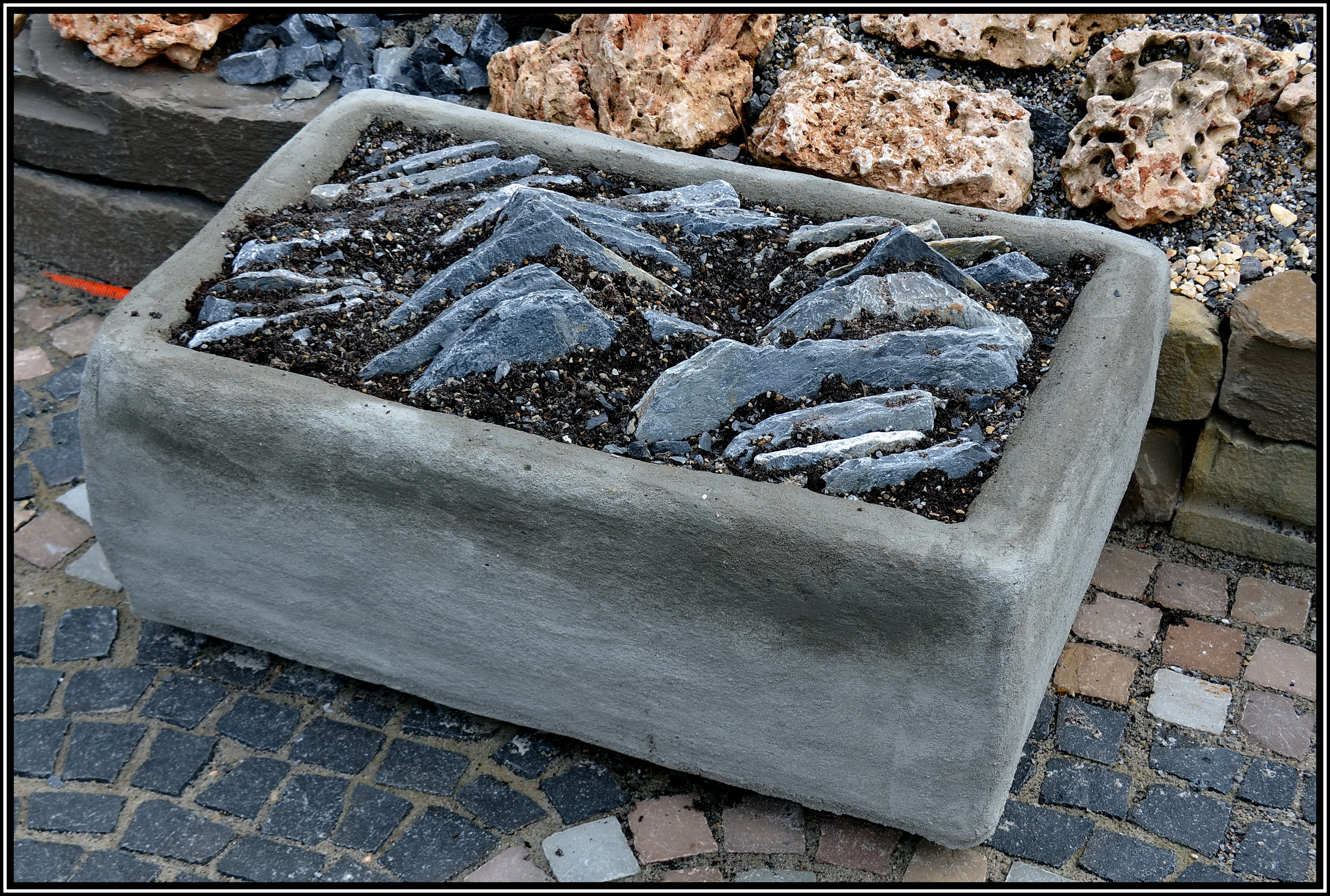 Die Tröge (10/23) Es dauert ein paar Tage, bis sich das Substrat zwischen den Schieferplatten gesetzt hat. Mit dem Bepflanzen sollte man daher geduldig sein. Beschleunigen kann man die Angelegenheit etwas durch einschlämmen mittels einer kräftigen Dusche.