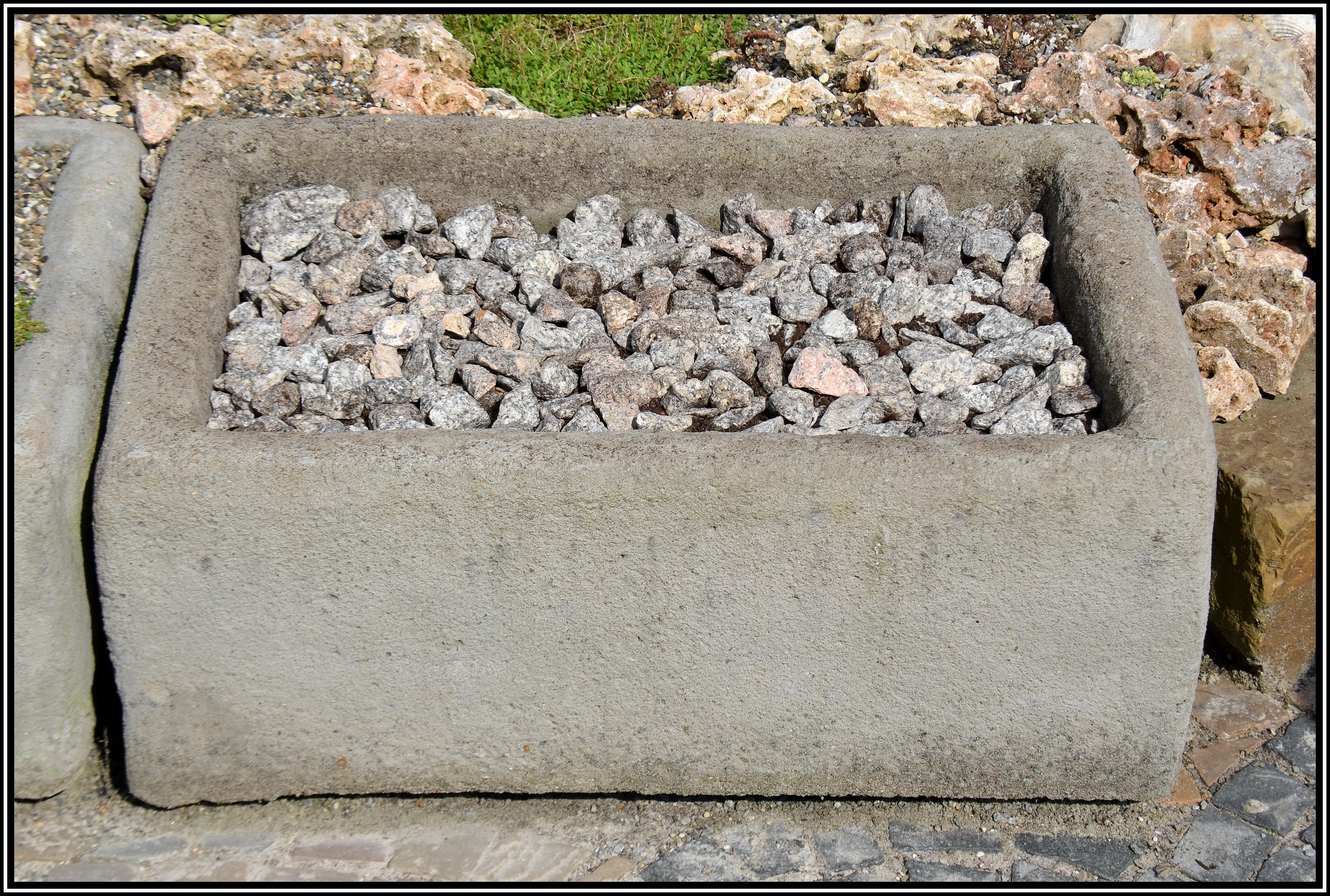 Die Tröge (11/23) Der letzte der drei Tröge ist nun mit leicht angewitterten Granitbrocken gefüllt worden. Es soll ein bunter Sempervivum-Trog werden. Bis die Pflanzen im August geliefert werden, hat das Substrat Zeit sich etwas zu setzen.