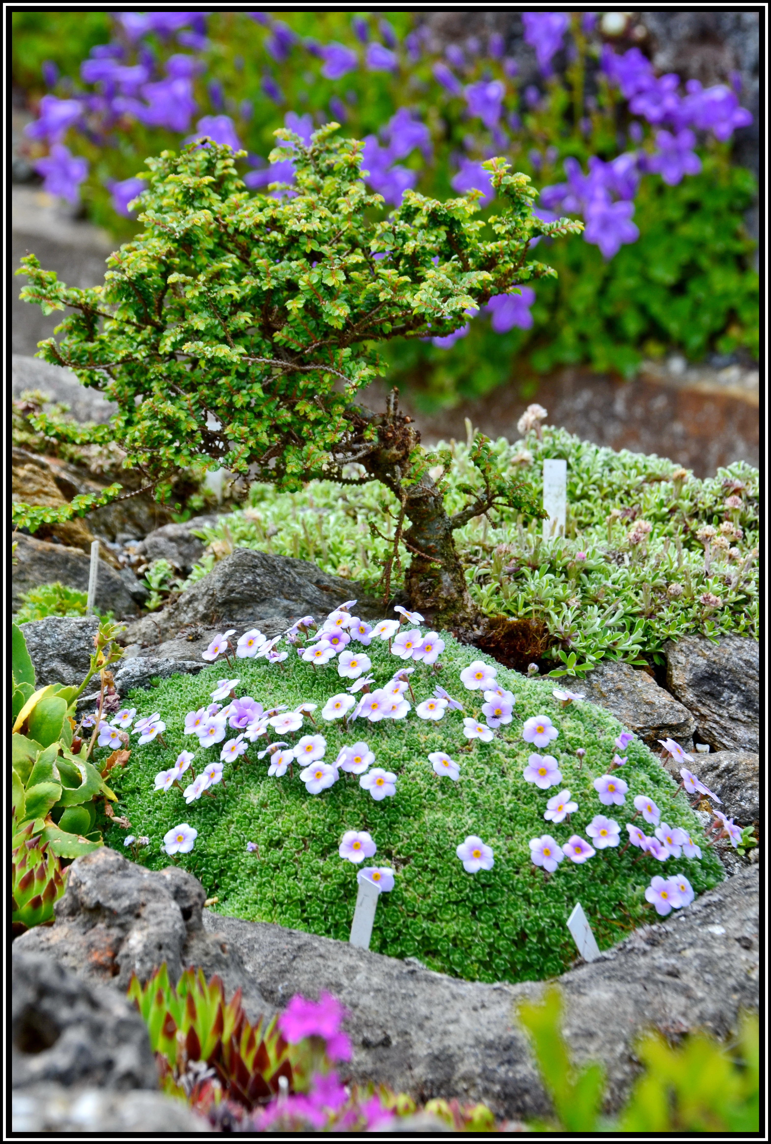 Androsace globifera und die kleine japanische Ulme mit dem Neuaustrieb im Mai.