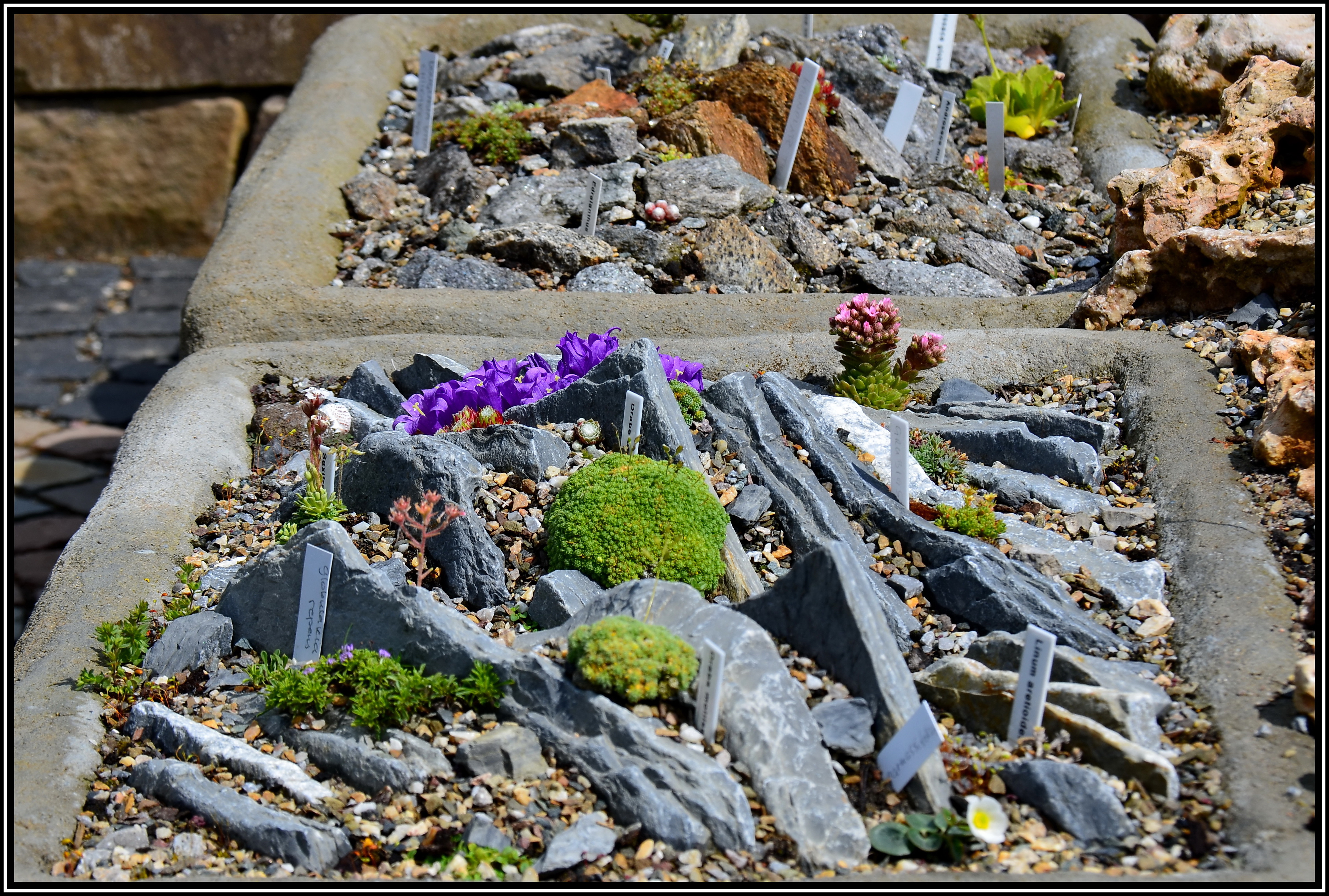 Die Tröge (7/23) Die Schieferplatten sind in Richtung Südwest nach Nordost ausgerichtet, damit auch sonnenempfindliche Pflänzchen einen schattigen Platz mit lediglich Morgensonne besiedeln können.