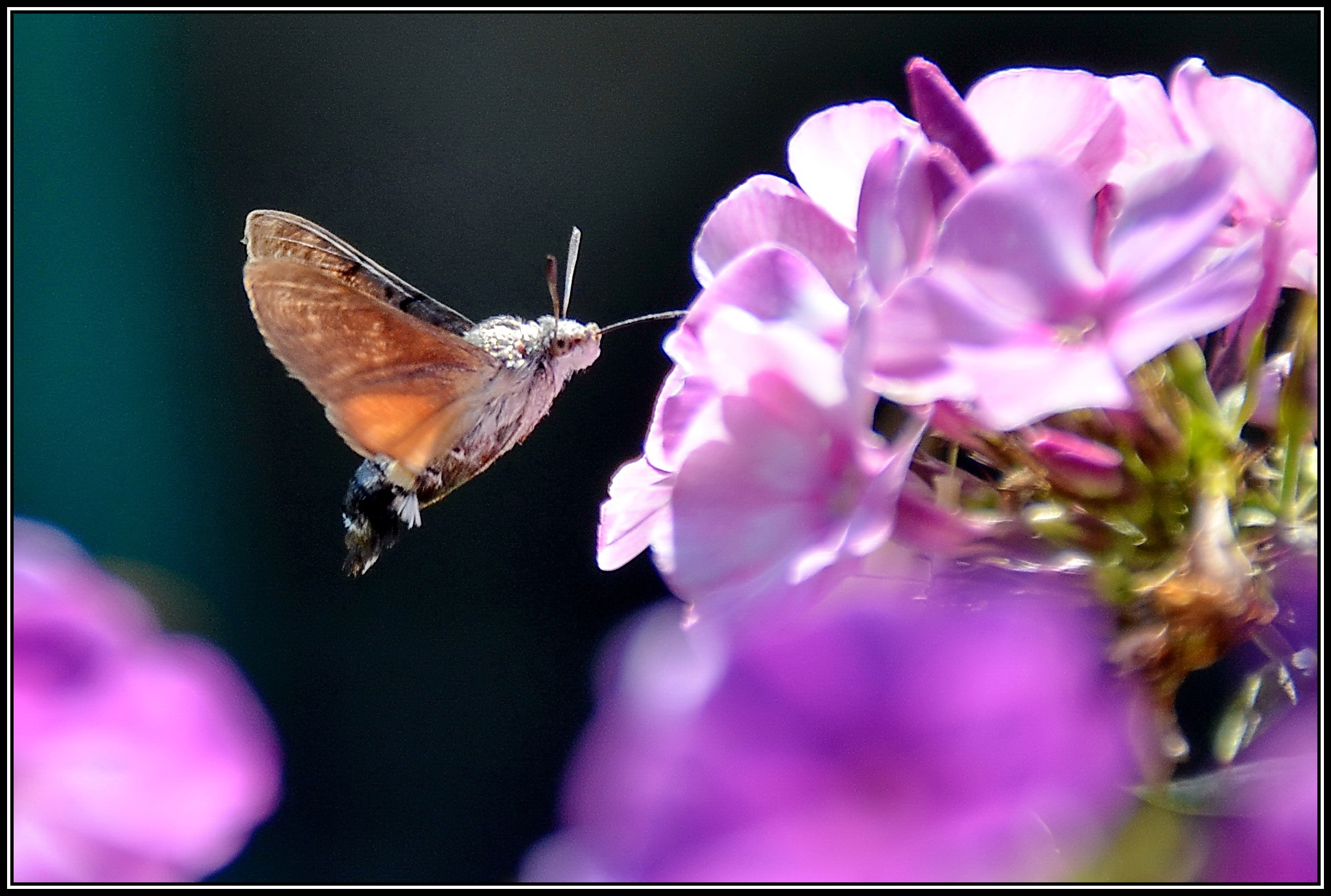 Was sonst noch so los ist ... (10/11) Das ist ein Taubenschwänzchen, der Kolibri unter den Schmetterlingen. Dieser sogenannte Wanderfalter stammt aus dem Mittelmeerraum. Dank günstigerer klimatischer Bedingungen ist er nunmehr häufiger in unseren Gärten anzutreffen.