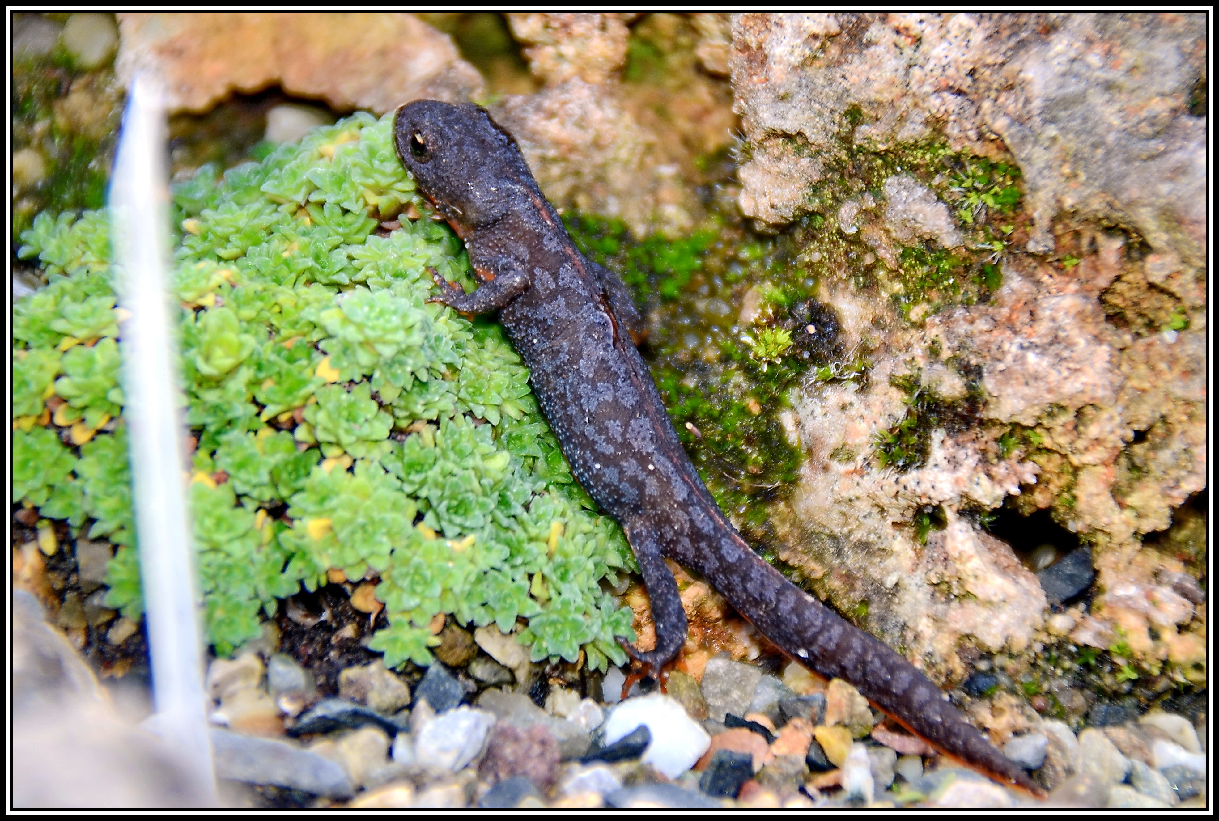 Der junge Bergmolch in seiner dunkelgrauen Landtracht geht eigentlich nur nachts auf die Jagd nach kleineren Insekten oder Würmern. Nur selten bekommt man mal einen zu Gesicht. Jetzt im Oktober hat er wohl noch ein Sonnenbad genommen. Er wird eine der zahlreichen Versteckmöglichkeiten hier im Tuffgestein nutzen, um zu überwintern.