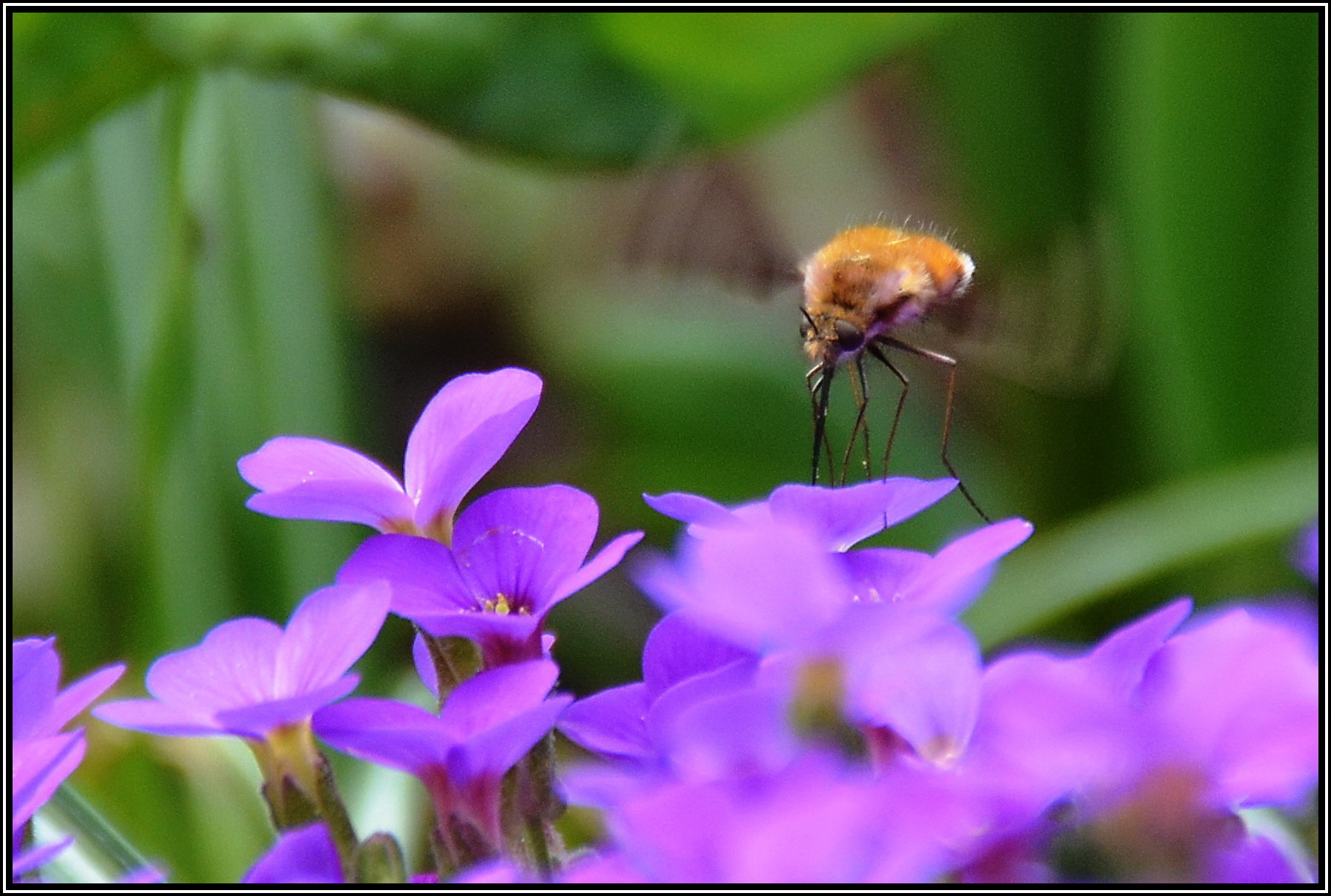 Ein Hummelschwärmer besucht das Blaukissen.