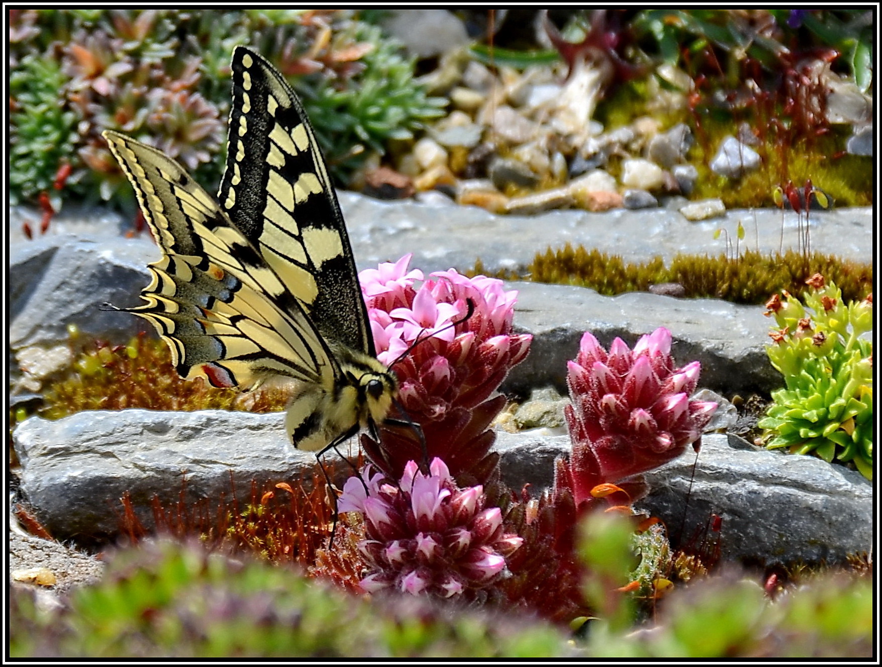 Ein Schwalbenschwanz besucht das kleine Sedum pilosum.