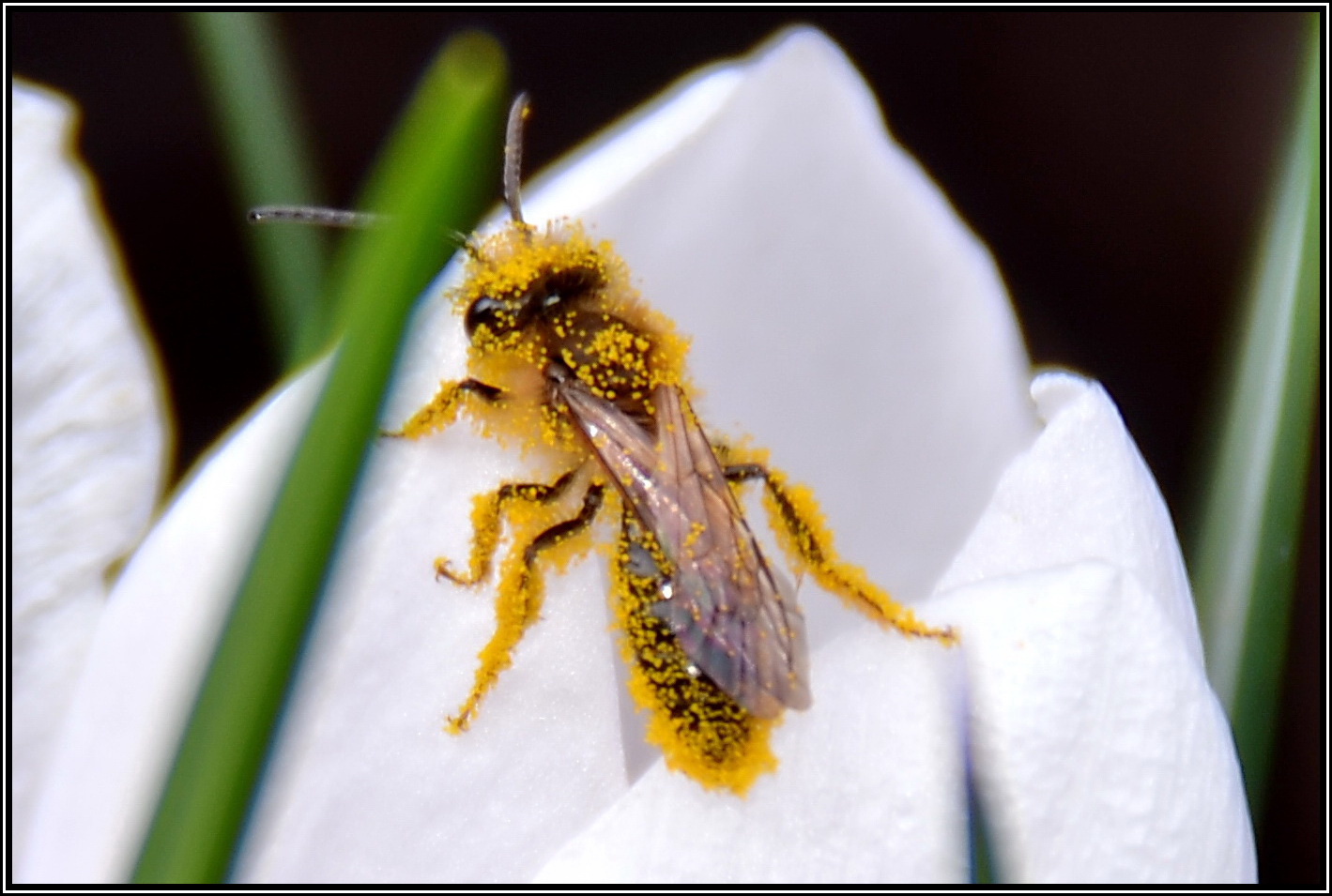 Diese kleine Solitärbiene hat ausgiebig in Pollen gebadet.
