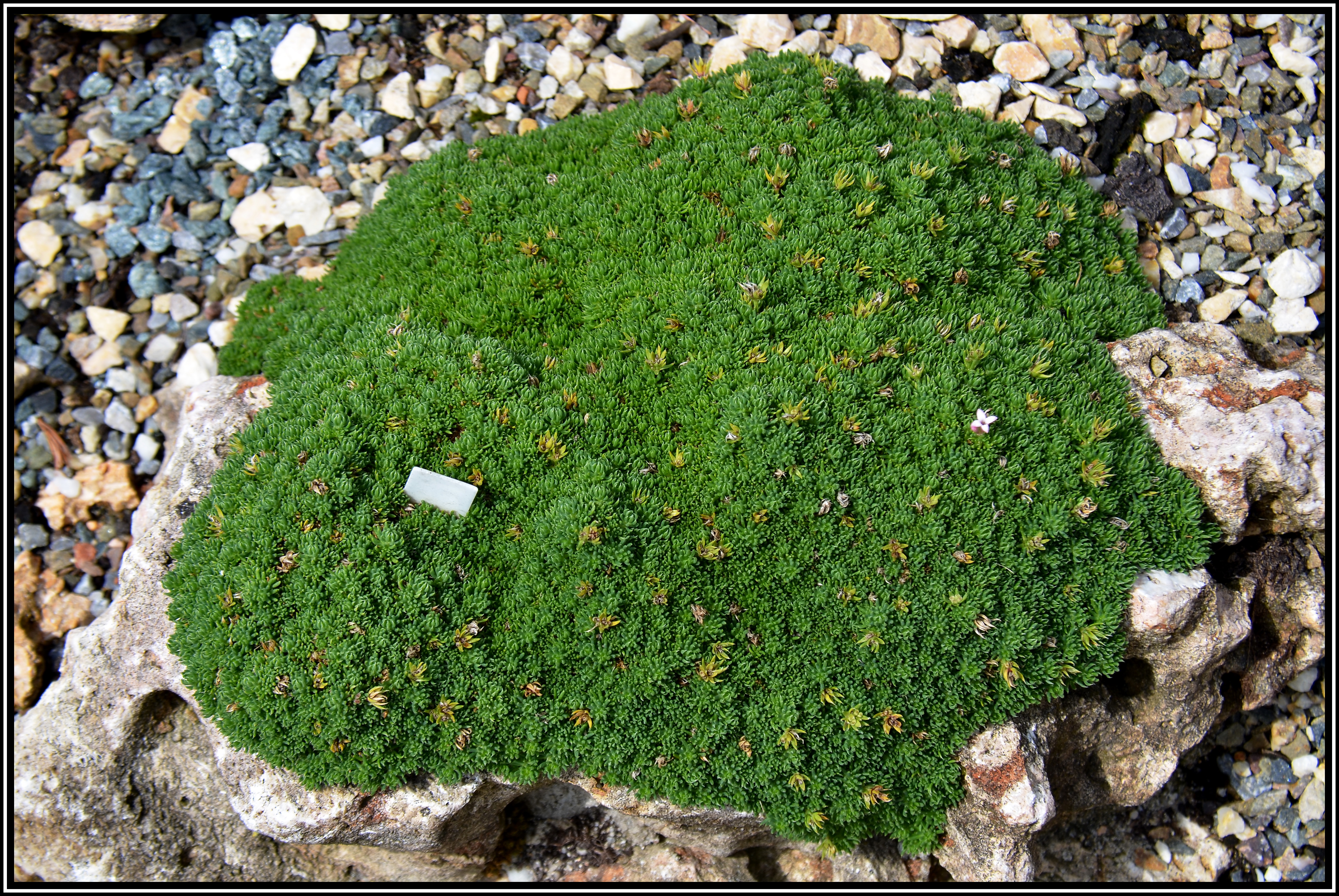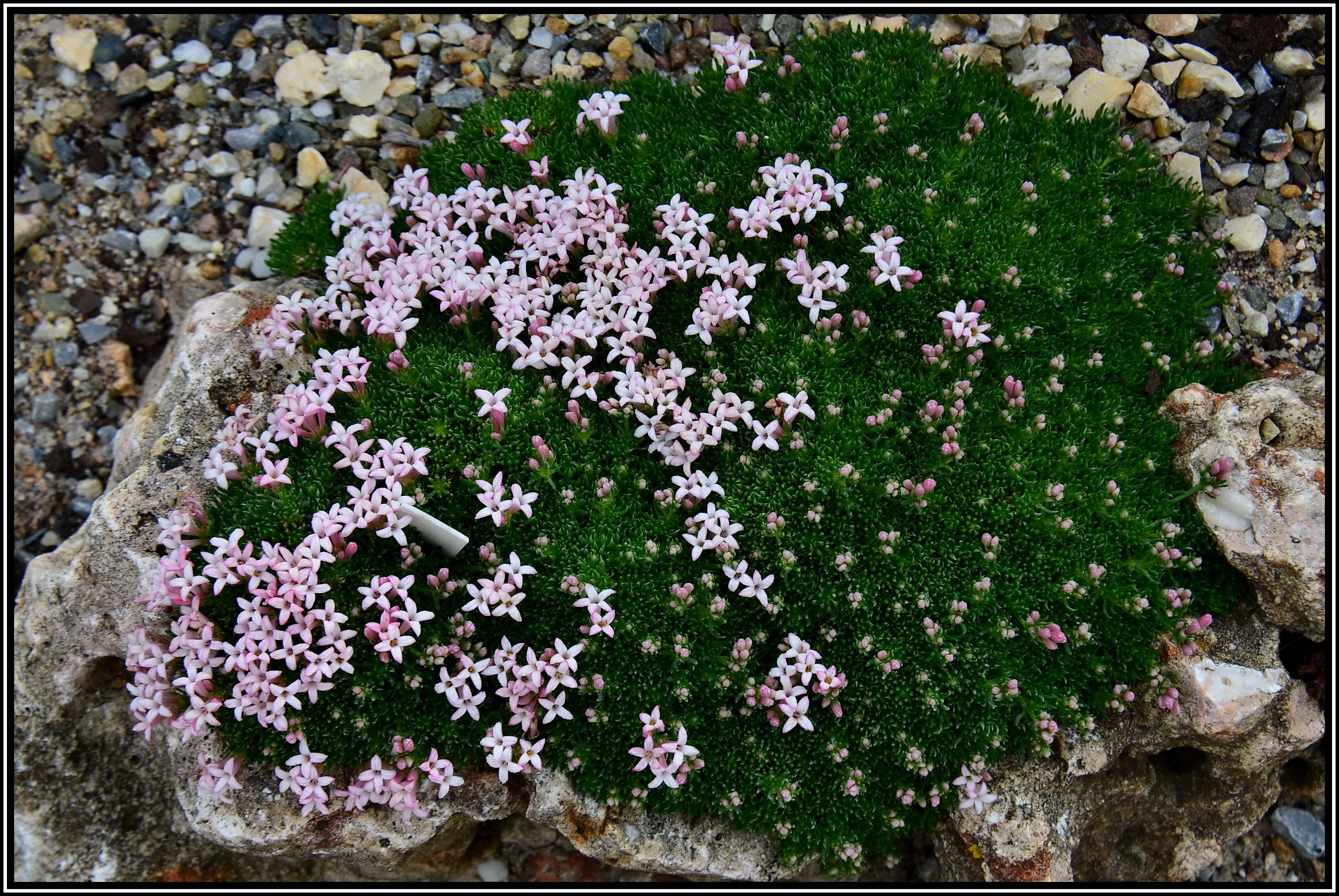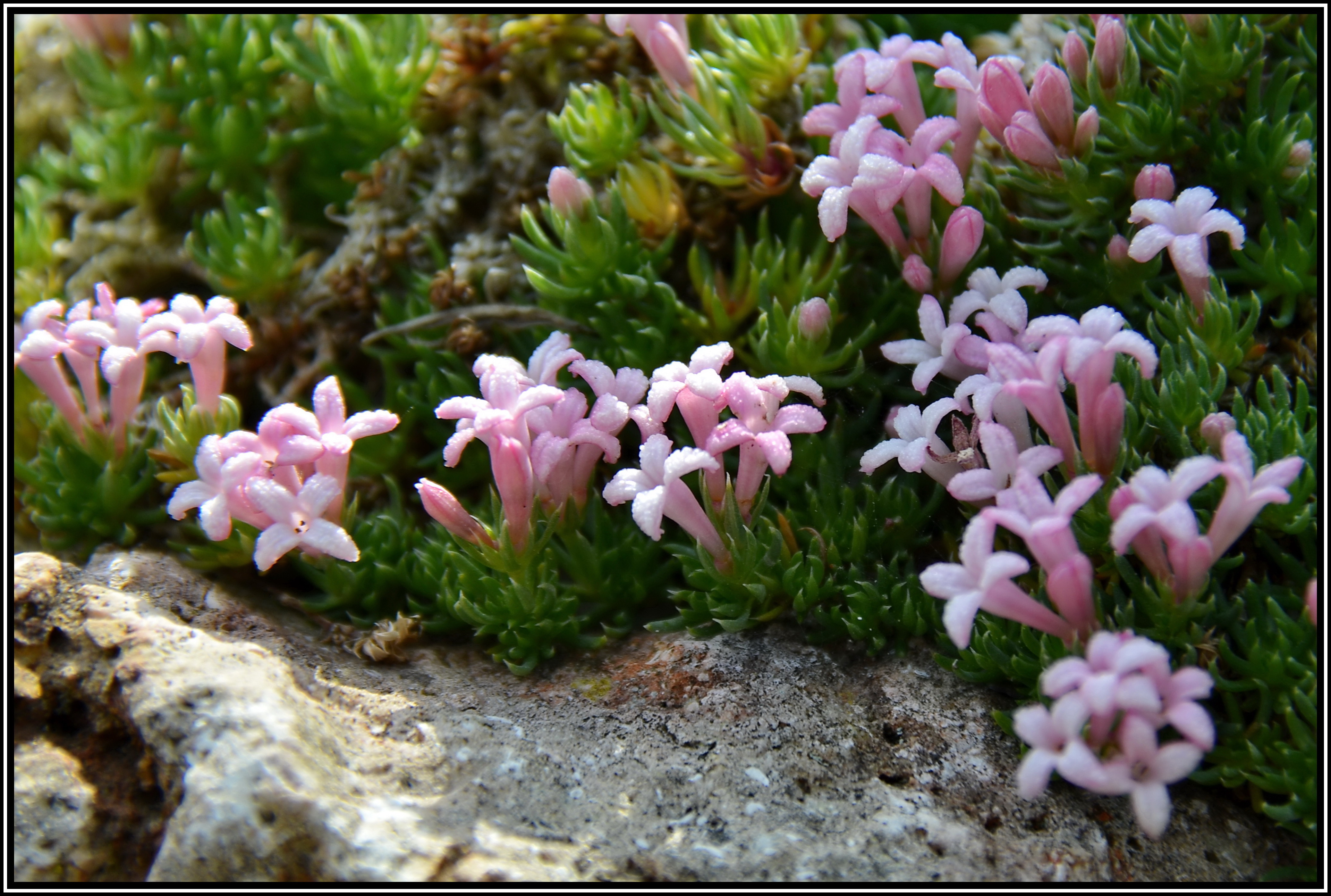 Dieses hübsche kleine Polster kommt aus Sizilien. Die Blüten erinnern sehr an Seidelbast-Blüten. Möchte im Winter trocken stehen.
