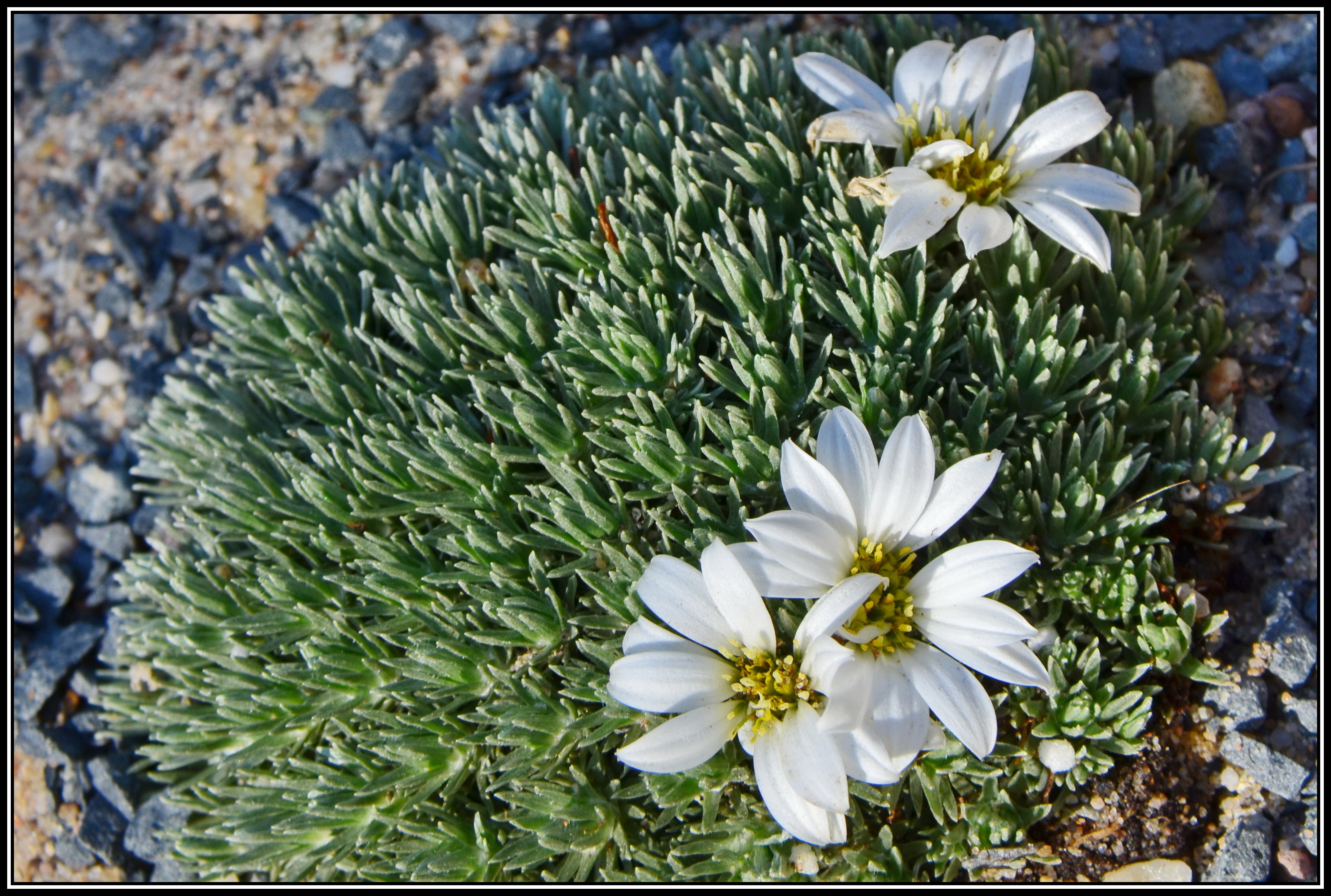 Dieses kleine Polster mit den grauen nadelförmigen Blättchen kommt aus Neuseeland (Südinsel) und gehört zu den Korbblütlern. Die hübschen fast aufsitzenden Blüten erscheinen schon im März. Die Pflanze gedeiht gut auf sandig-lehmigen Substrat, das immer ein wenig feucht sein sollte. Sie verträgt hohe Temperaturen und extreme Sonneneinstrahlung nicht gut, ist dagegen frosthart bis Minus 12°C.