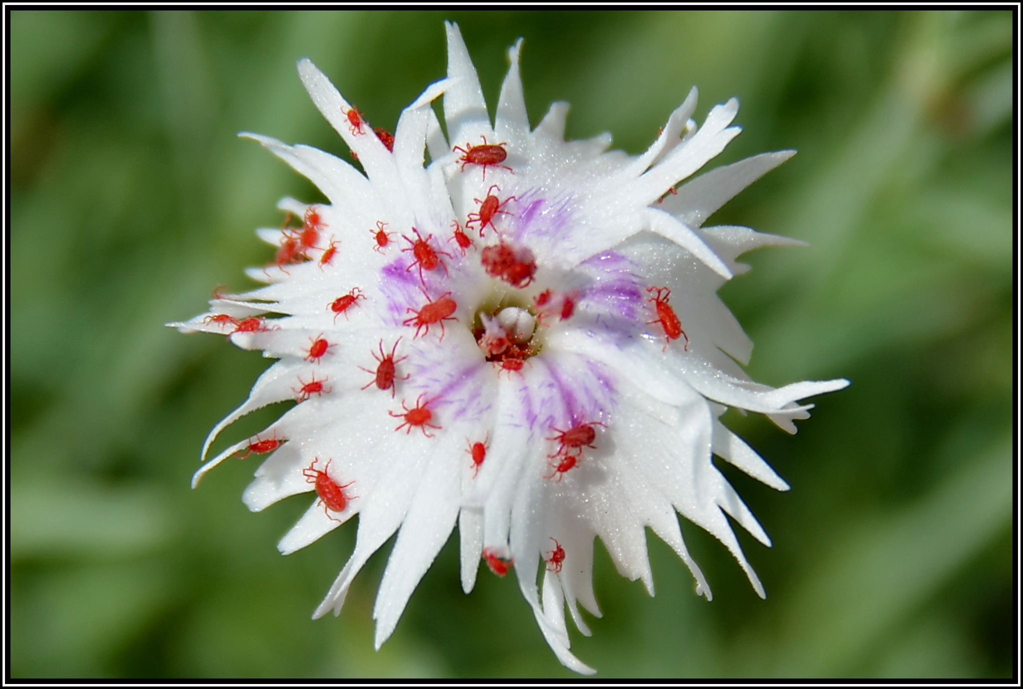 Die Rote Raubmilbe tummelt sich massenhaft im Juni auf den Blüten.