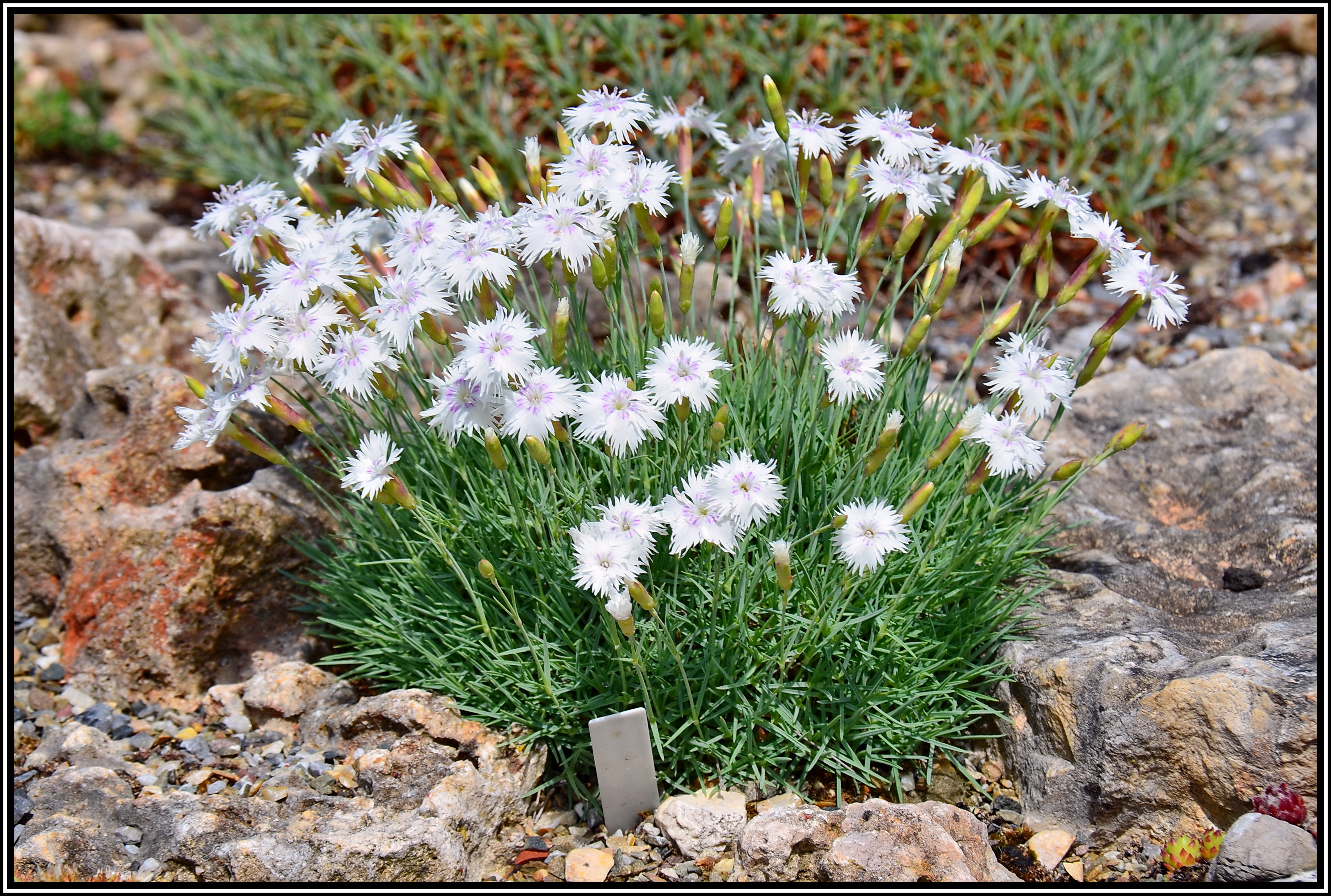 Eine fast weiße Form der Alpen-Nelke. An trockener Stelle im Kalkschotter. Im Tiefland verlängert sie ihre Blütenstängel etwas, weil ihr das UV-Licht der Höhen fehlt.