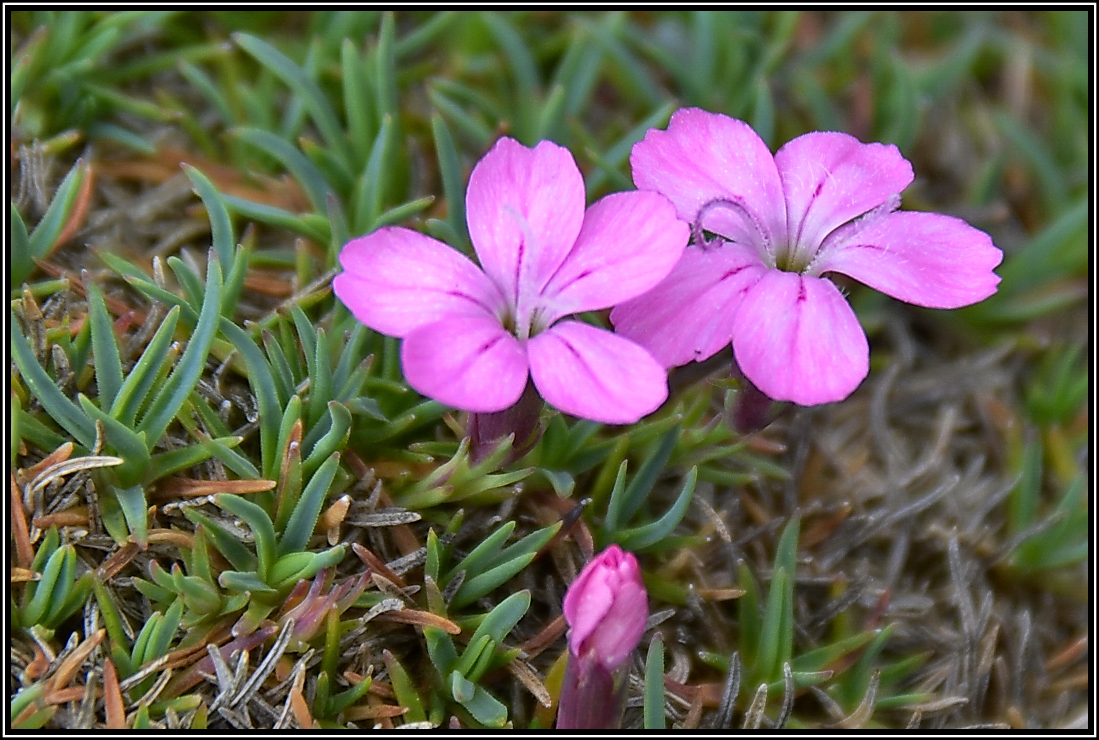 Diese Zwergnelke kommt aus Bulgarien und bildet ein kleines Polster mit fast aufsitzenden Blüten.