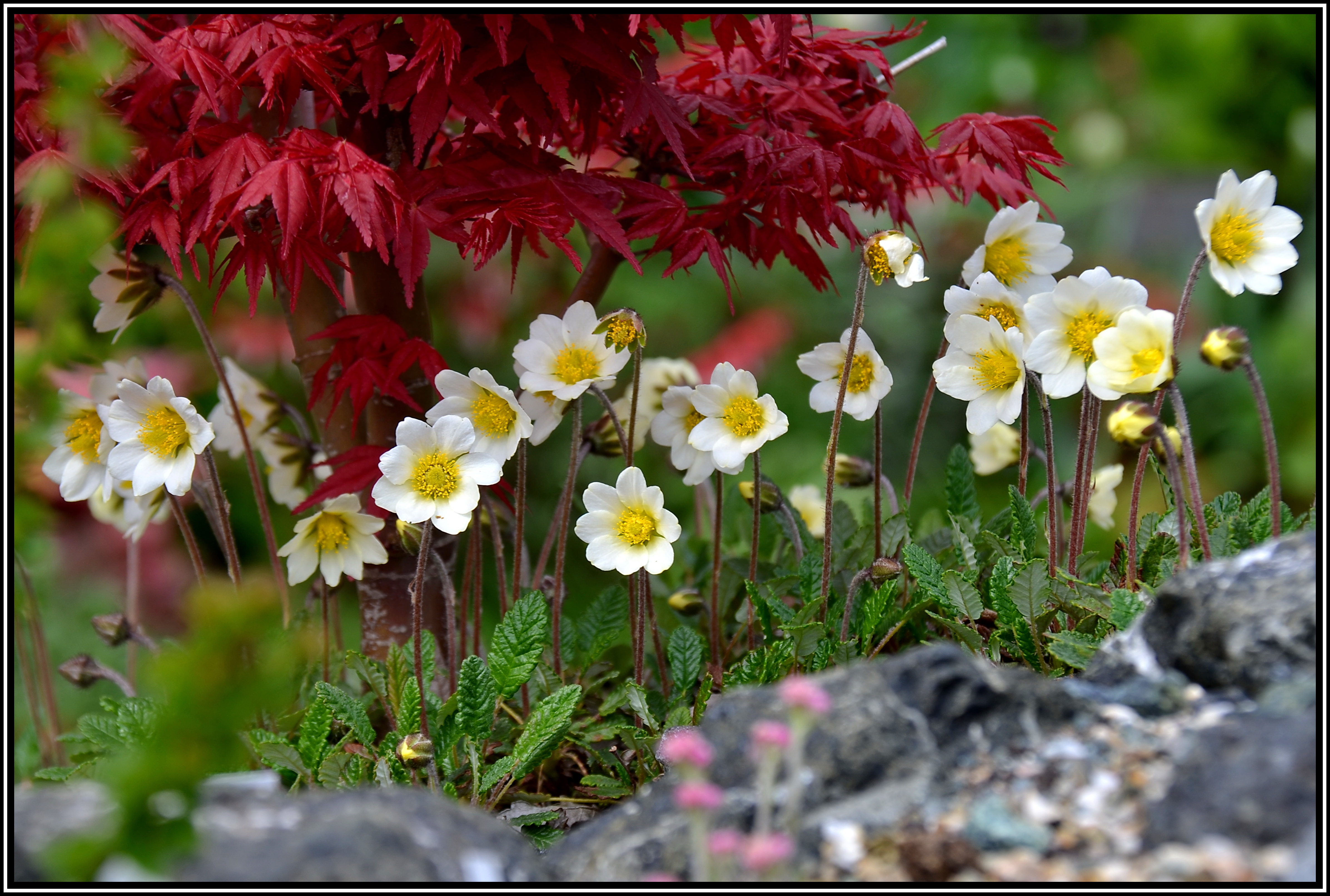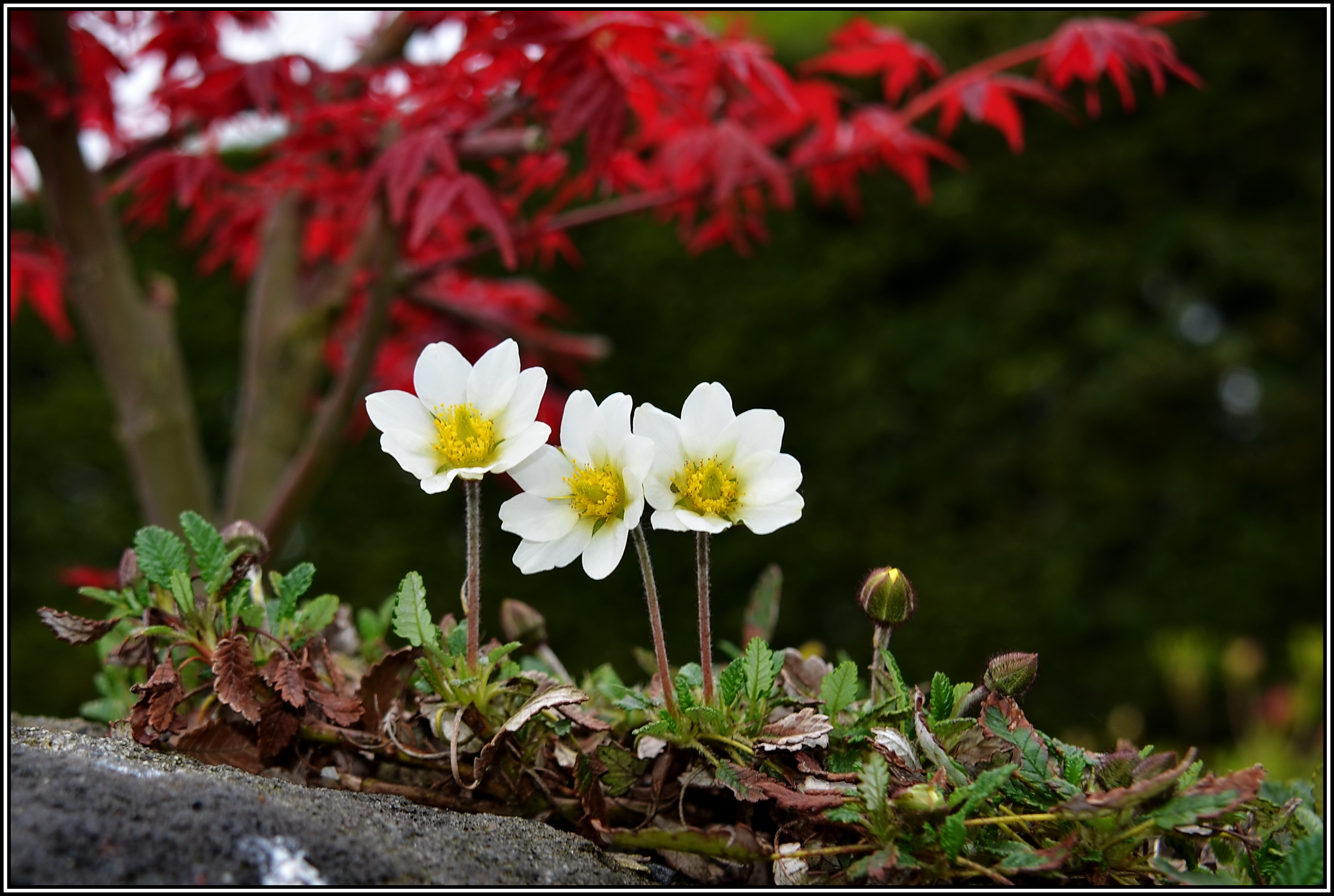 Hier in sehr schönem Kontrast zum roten Laub des Japanischen Ahorn.