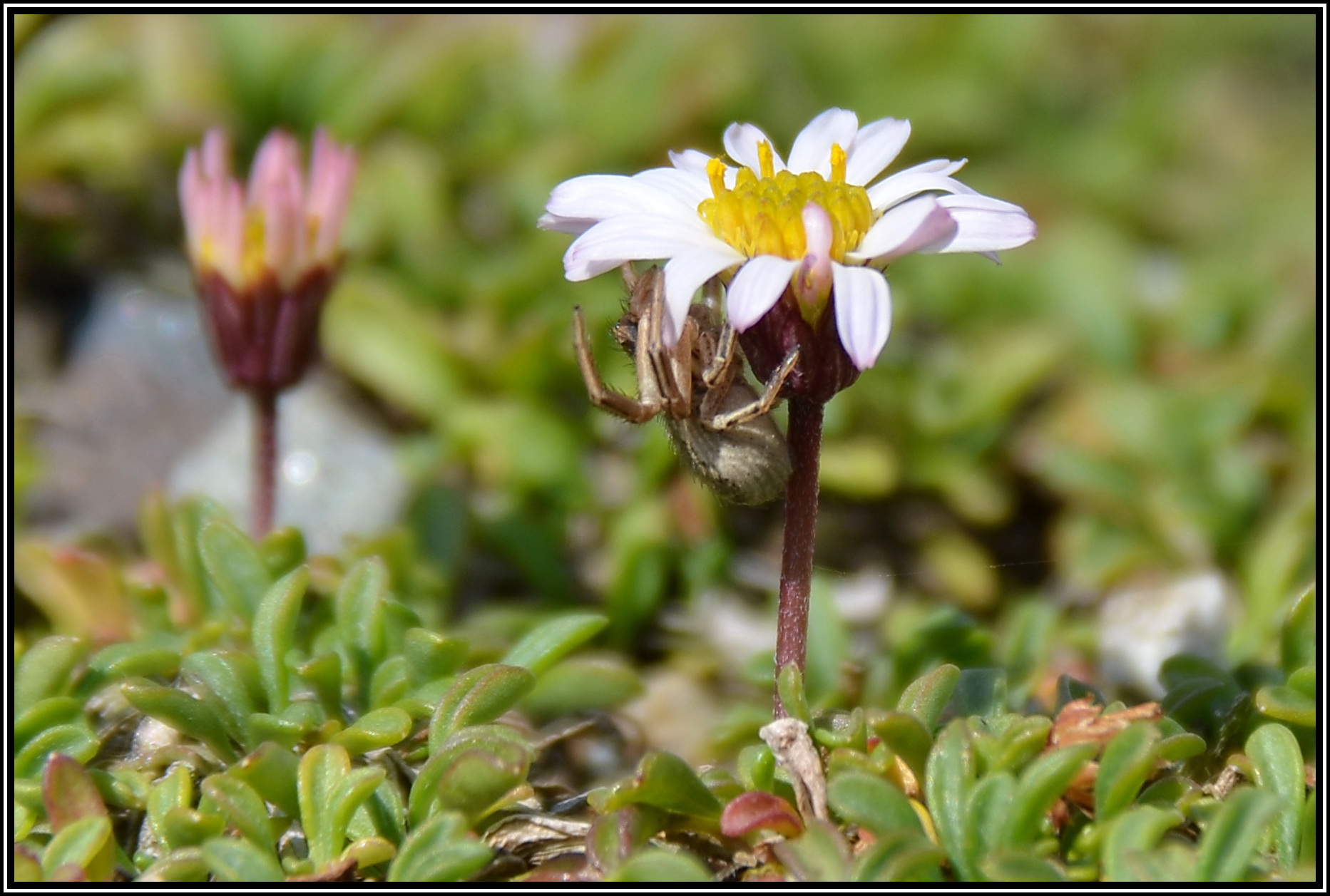 Eine kleine Krabbenspinne versteckt sich unter dem Blütenkelch.