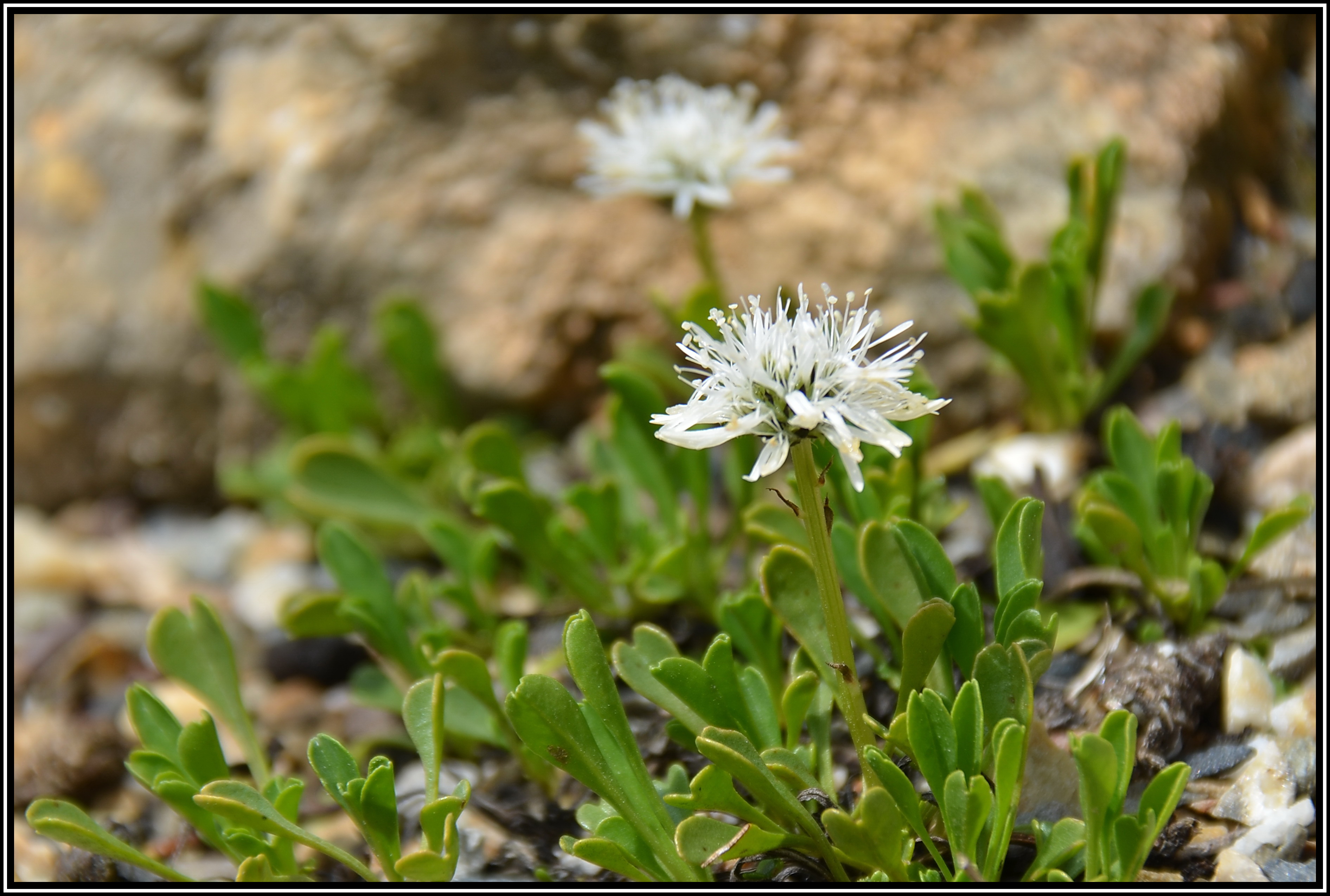 Die Herzblättrige Kugelblume ist ein Wegerichgewächs, mit der Wuchsform eines Spalierstrauches, das heißt, die kleinen Triebe verholzen mit den Jahren an der Basis und bilden ein dichtes Geflecht, in dem sich Humus oder andere Nährstoffe verfangen und ansammeln können, die die Pflanze so für sich nutzen kann. Die Pflanzengattung der Kugelblumen ist recht jung, und laut Wikipedia vermutlich erst nach der letzten Eiszeit entstanden. In der Natur kommt sie verbreitet in unseren Alpen vor, gerne auf Kalk.