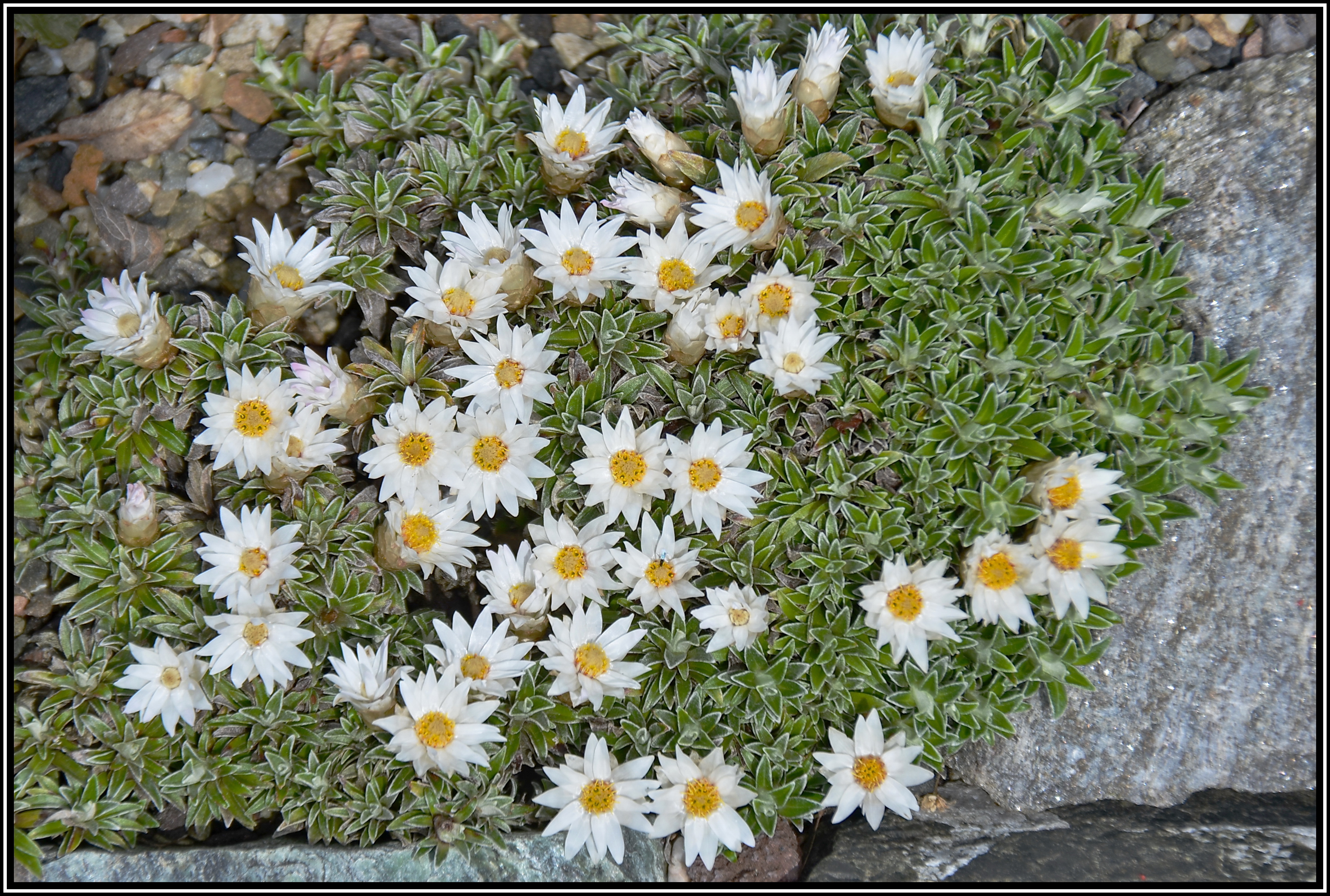 Ein mattenbildendes, zwergig wachsendes Strohblümchen. Kommt aus Südafrika und möchte einen trockenen, nach Süden ausgerichteten Standort im Urgesteinschotter und voller Sonne. Zum Schutz vor Nässe im Winter decke ich ein Glasschälchen drüber.