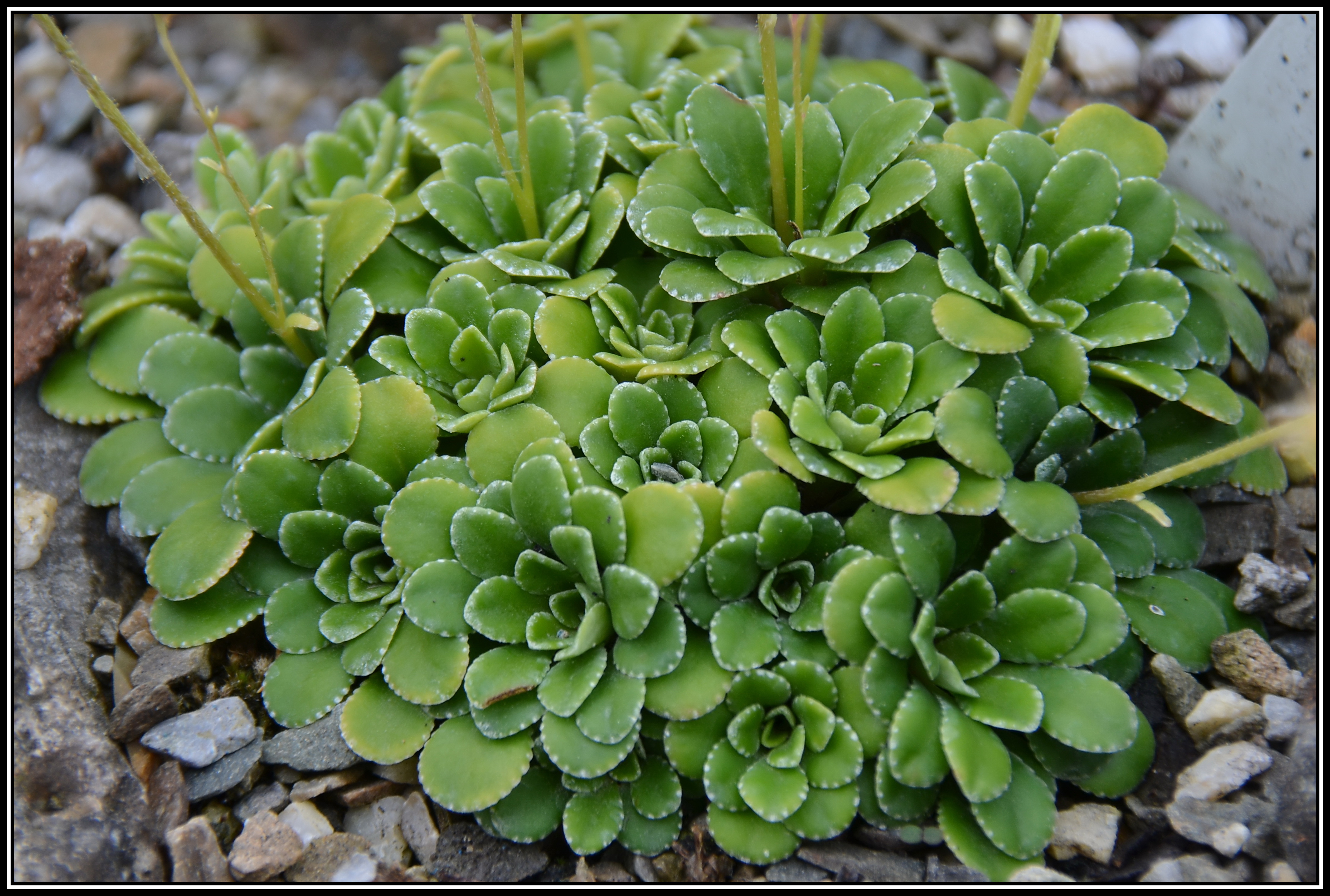 Dieser Steinbrech ist eine Naturhybride, also eine Kreuzung aus Saxifraga cuneifolia und Saxifraga callosa. Die Blattrosetten sind etwas größer als die von cuneifolia und haben an den Rändern deutlich sichtbare Kalkkrusten, was auf Saxifraga callosa hindeutet. Im Laufe der Zeit bildet sich ein dicht wachsender Tuff, die zarten weißen Blüten erscheinen im Juni.