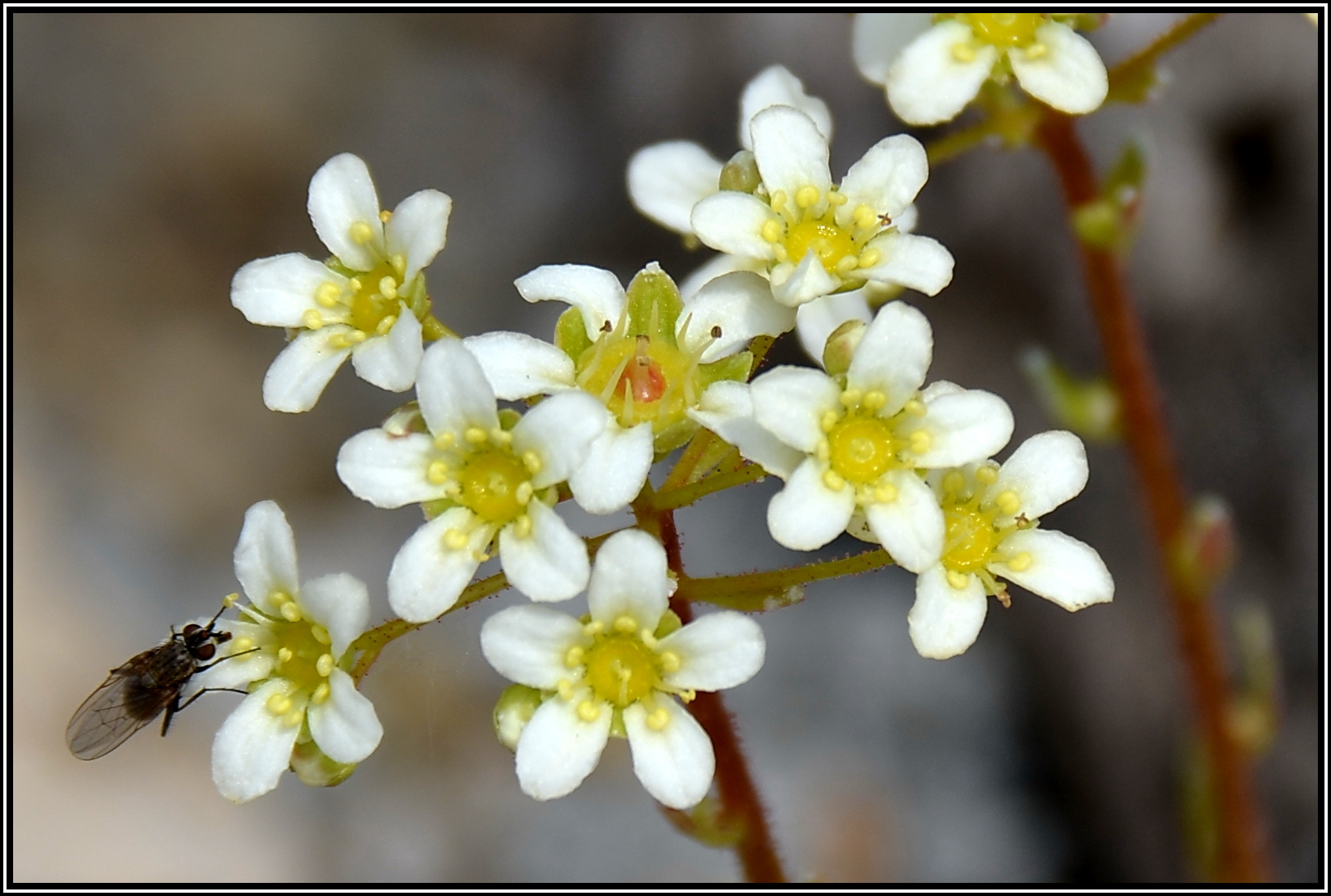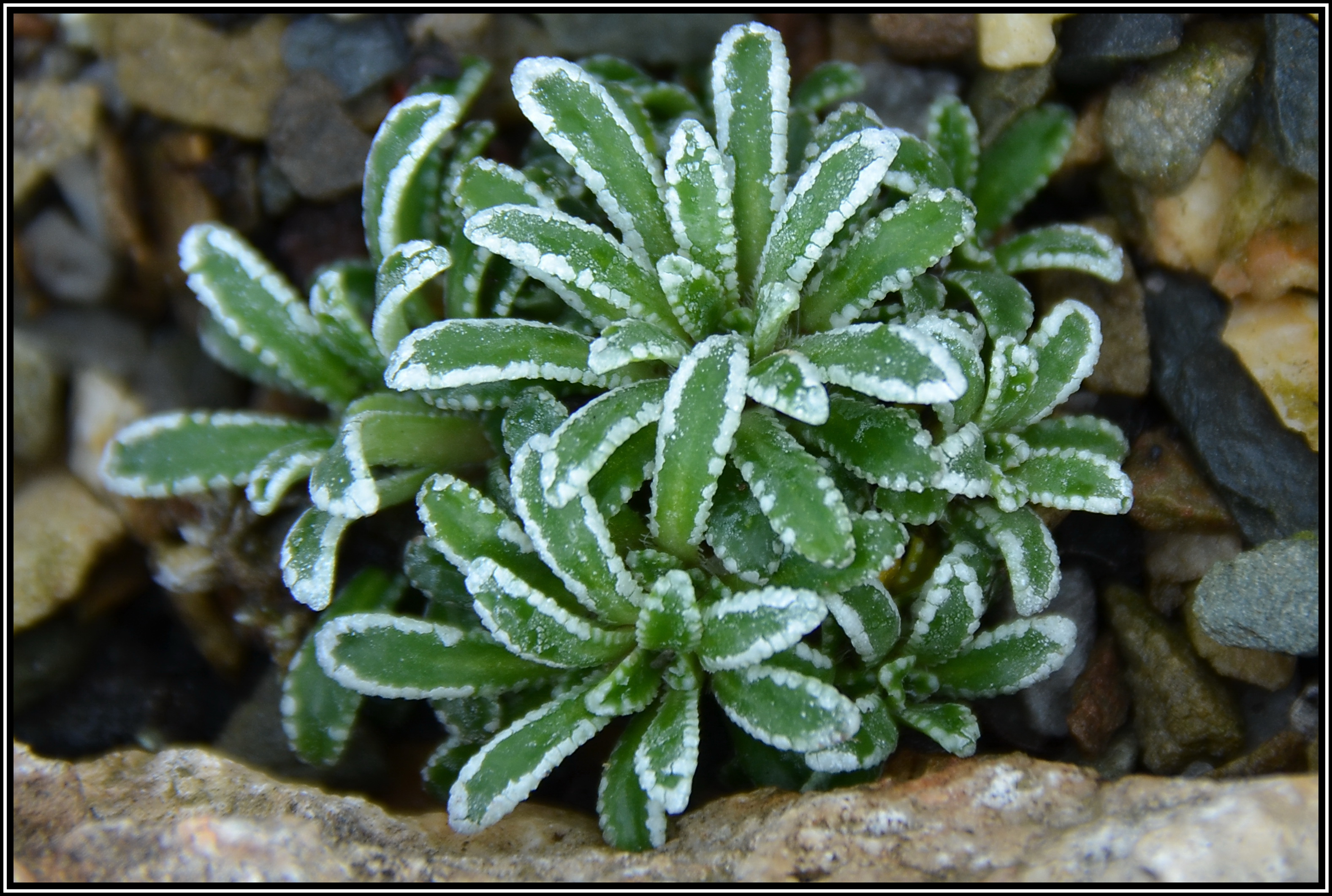 An den Blatträndern bildet dieser Steinbrech einen ausgeprägten Kalkrand, was ihn optisch schon interessant macht. Außerdem ist er ein Endemit, der nur in den südöstlichen Kalkalpen zu finden ist. Die Blattrosetten sind mit zwei Zentimetern Durchmesser eher klein und stehen dicht gedrängt. Die Blüten erscheinen Ende Mai auf langen Stielchen. Sie sind nicht reinweiß, eher champagner-gelblich. An absonniger Spalte im Kalktuff oder feinem Schotter ohne pralle Mittagssonne und nicht ganz so trocken, das wäre ein geeigneter Pflanzplatz.