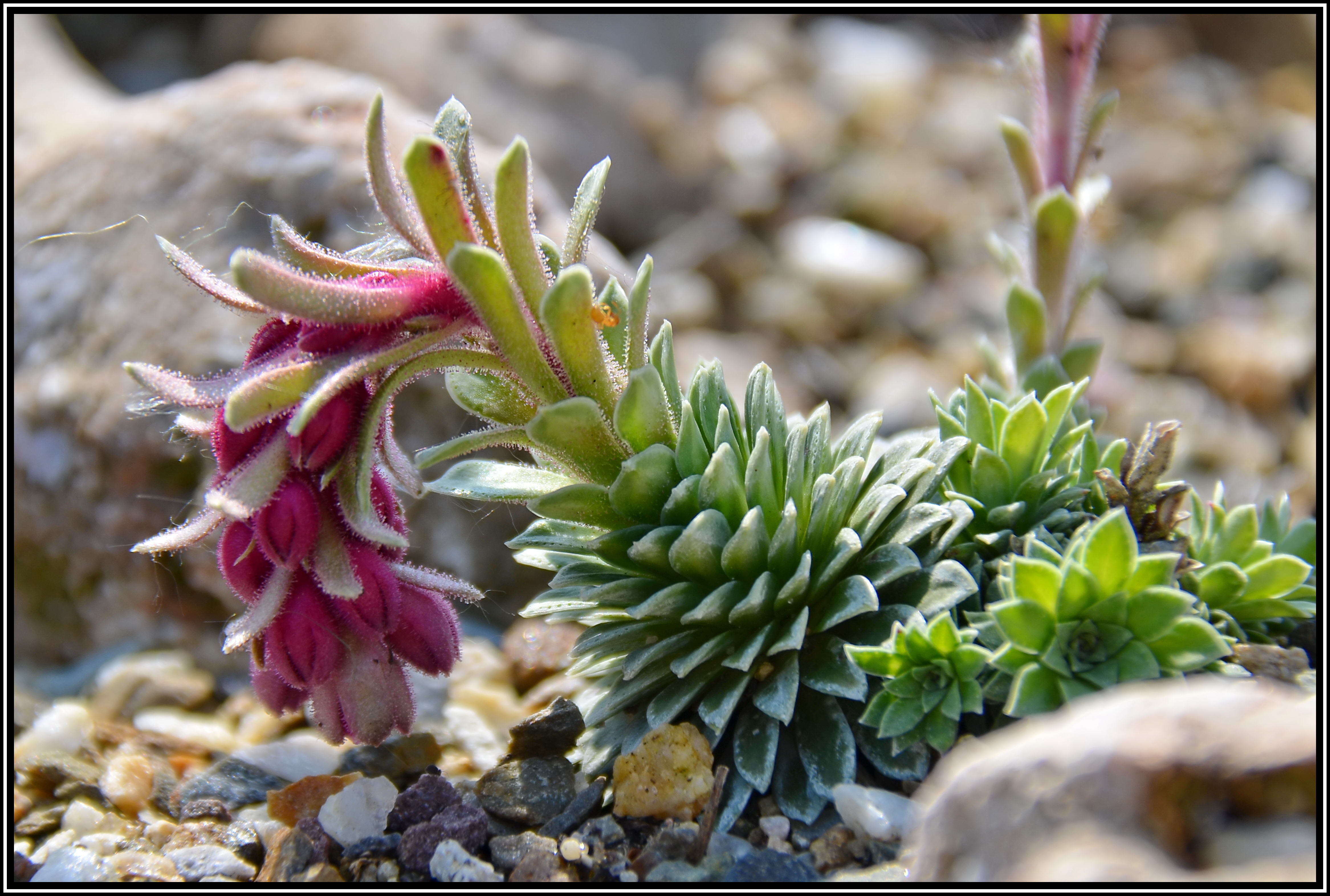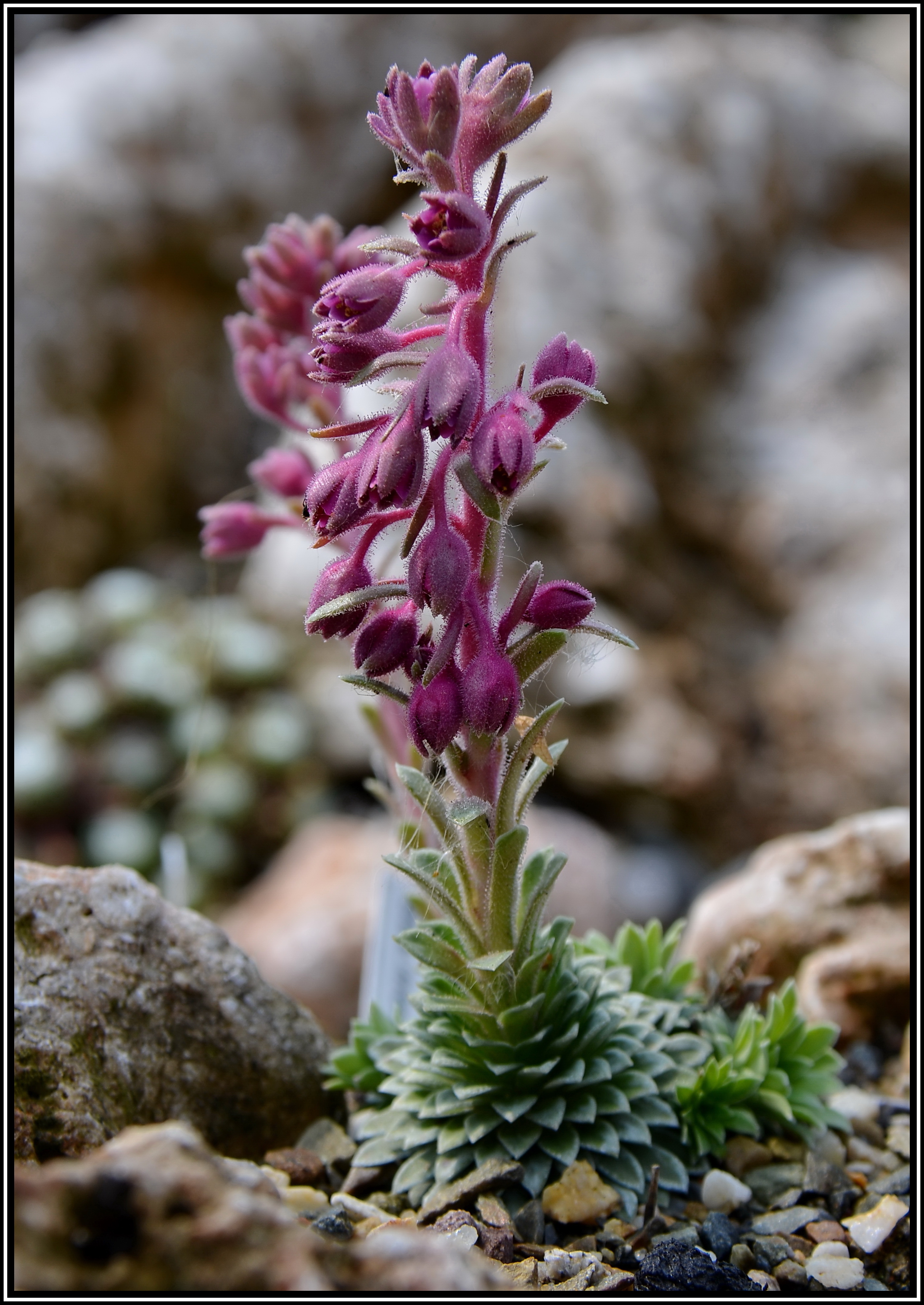 » Home » » Saxifraga media Steinbrech Das kleine Pflänzchen kommt aus den Pyrenäen und wächst auf Kalkschotter, etwas absonnig, vielleicht schattiert durch einen kleinen Laubbaum. Der Blütenstand ist eher unscheinbar,die einzelnen Blütchen schauen so unmotiviert nach unten. » Home » »