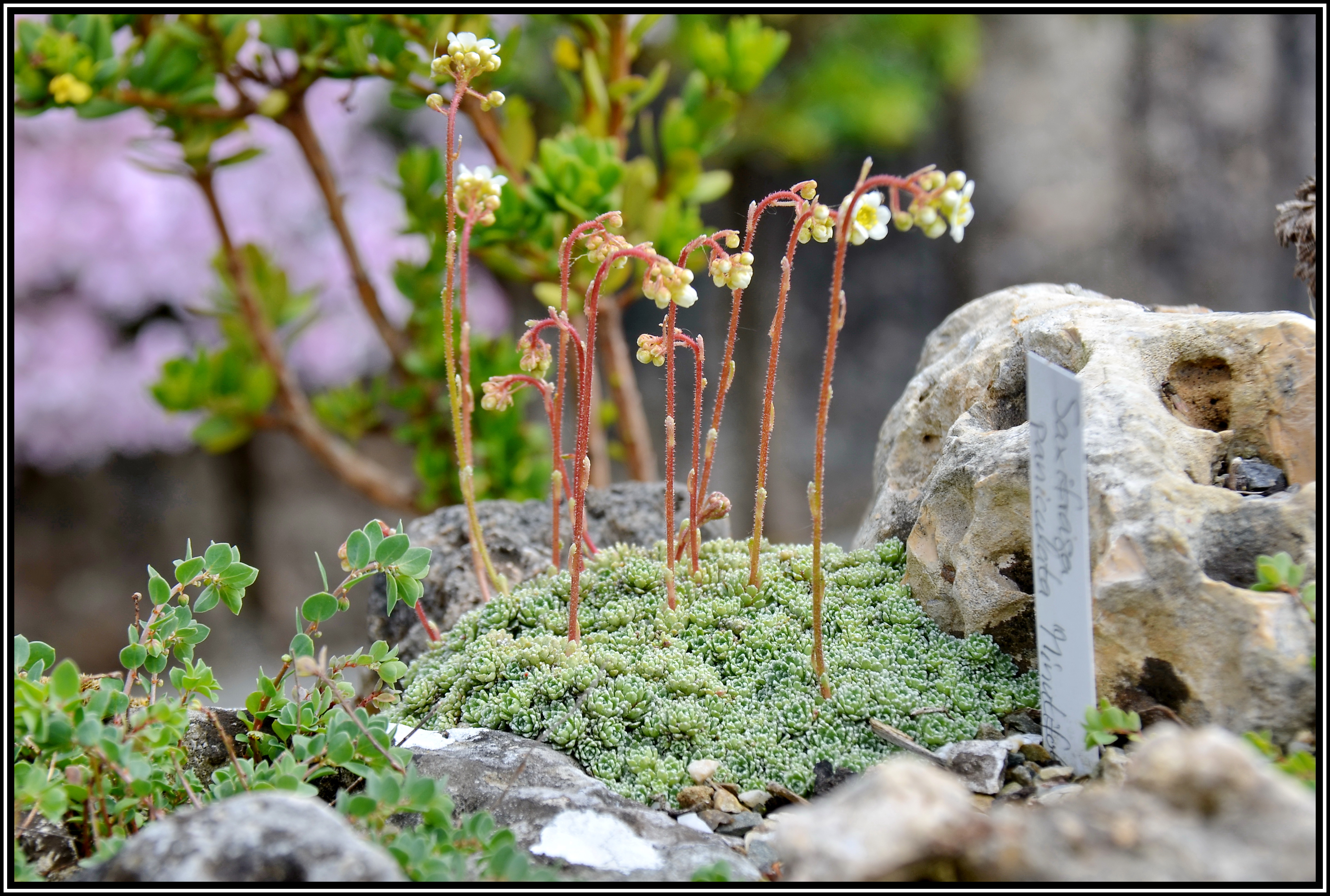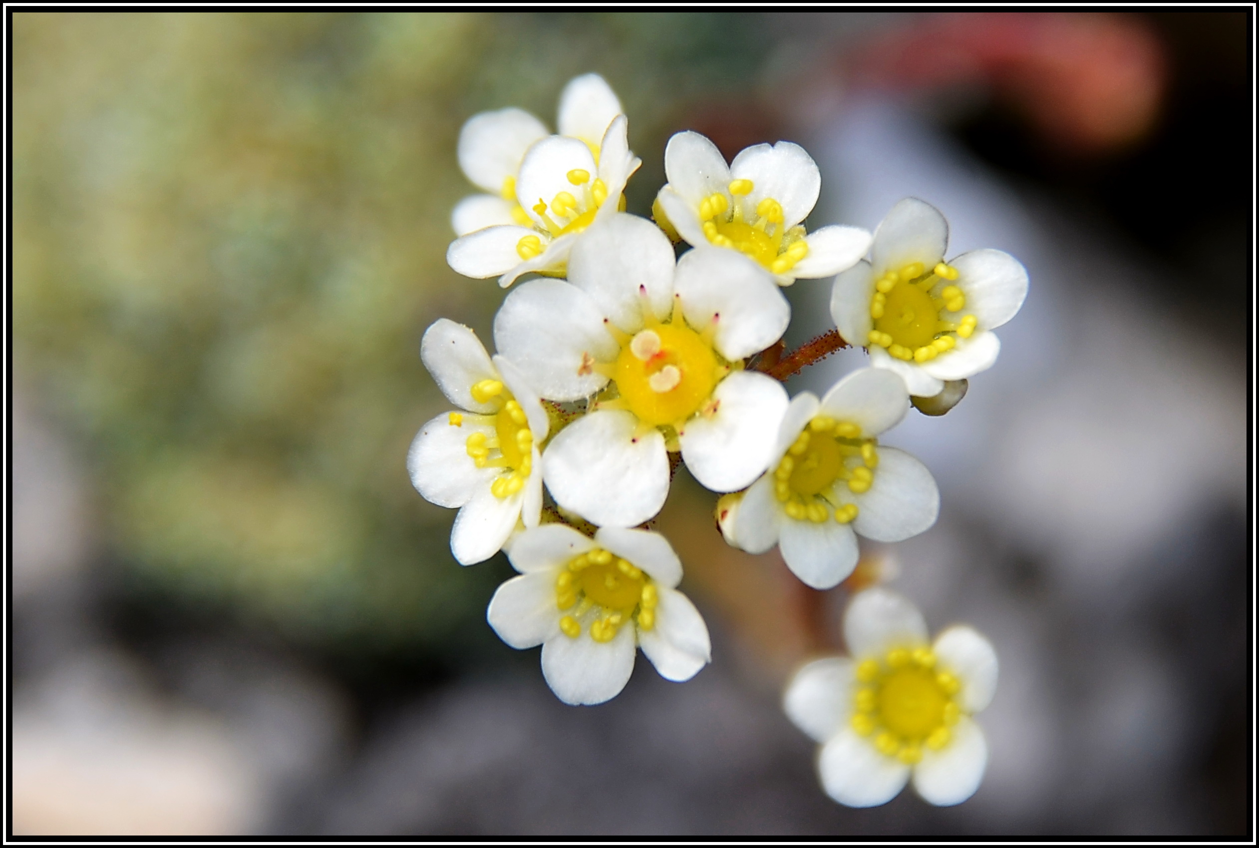 Dieser Traubensteinbrech hat, wie der Name schon sagt, winzige Blattrosetten, die sehr dicht stehen und an den Rändern kalkverkrustet sind.