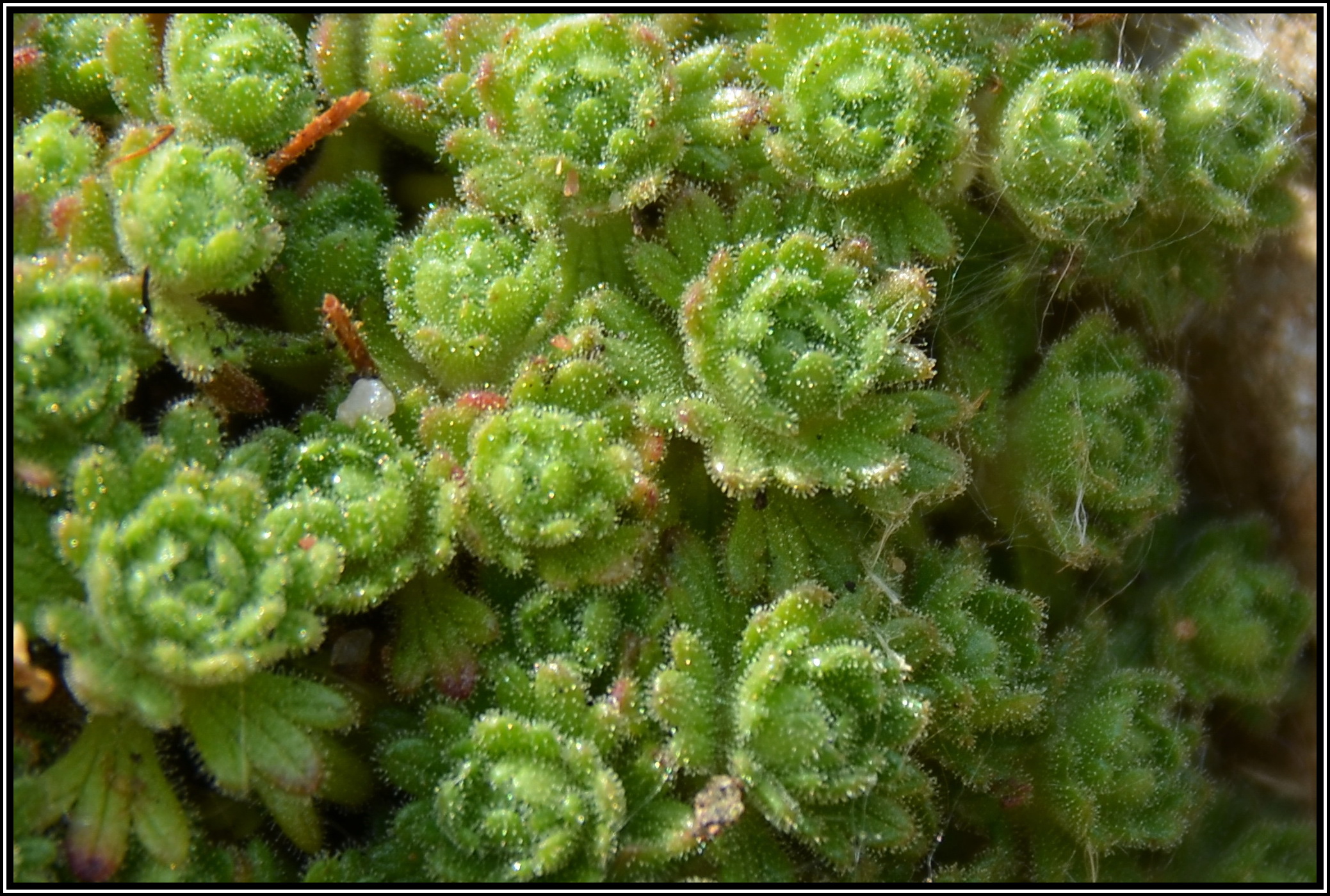 Die Blattrosetten sind sehr flach und stark behaart, was ungewöhnlich ist für einen Steinbrech. Das deutet eigentlich auf eine gewisse Anpassung gegen starke Sonneneinstrahlung hin, ich habe aber die Erfahrung gemacht, daß das Pflänzchen besser im Schatten gedeiht.
