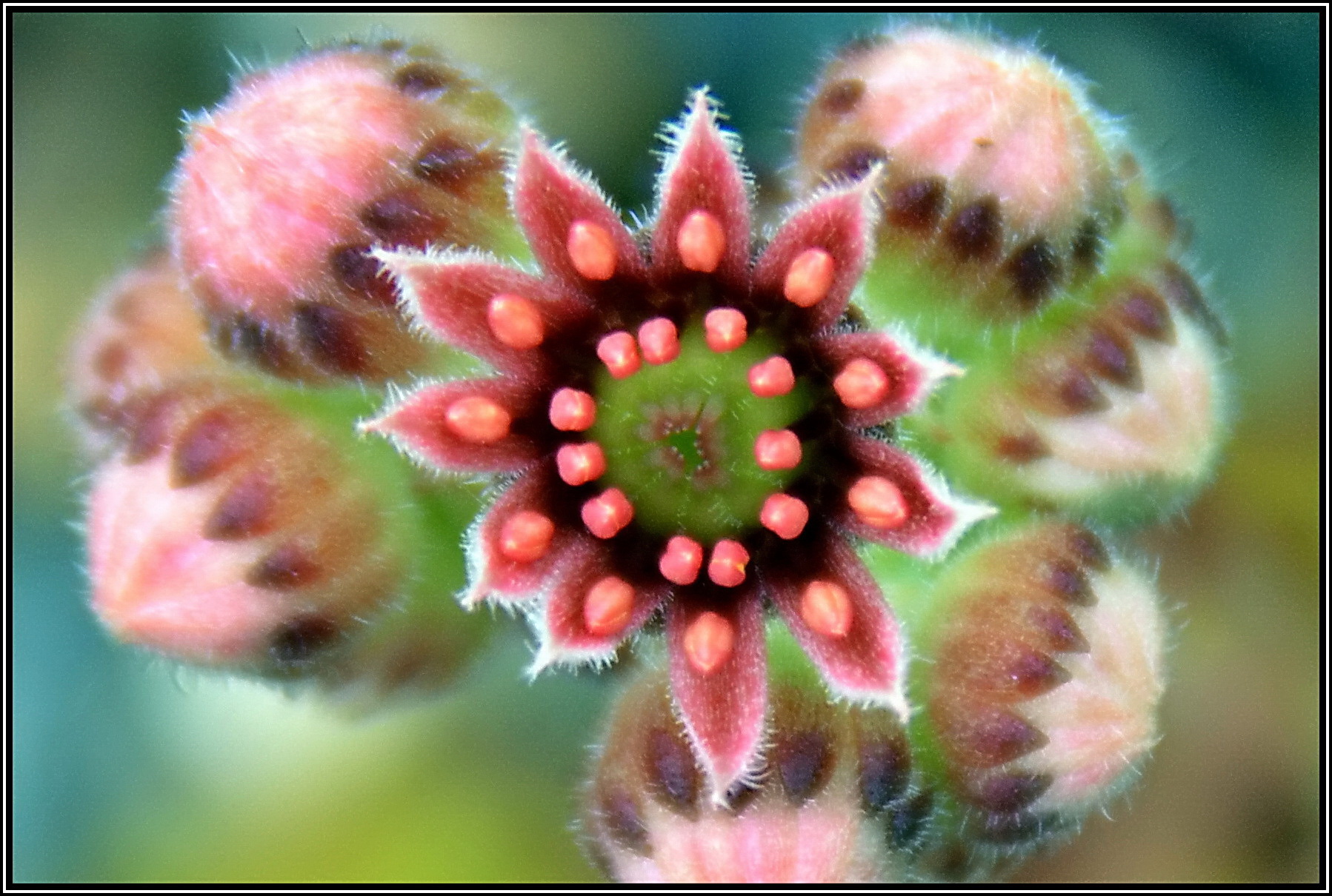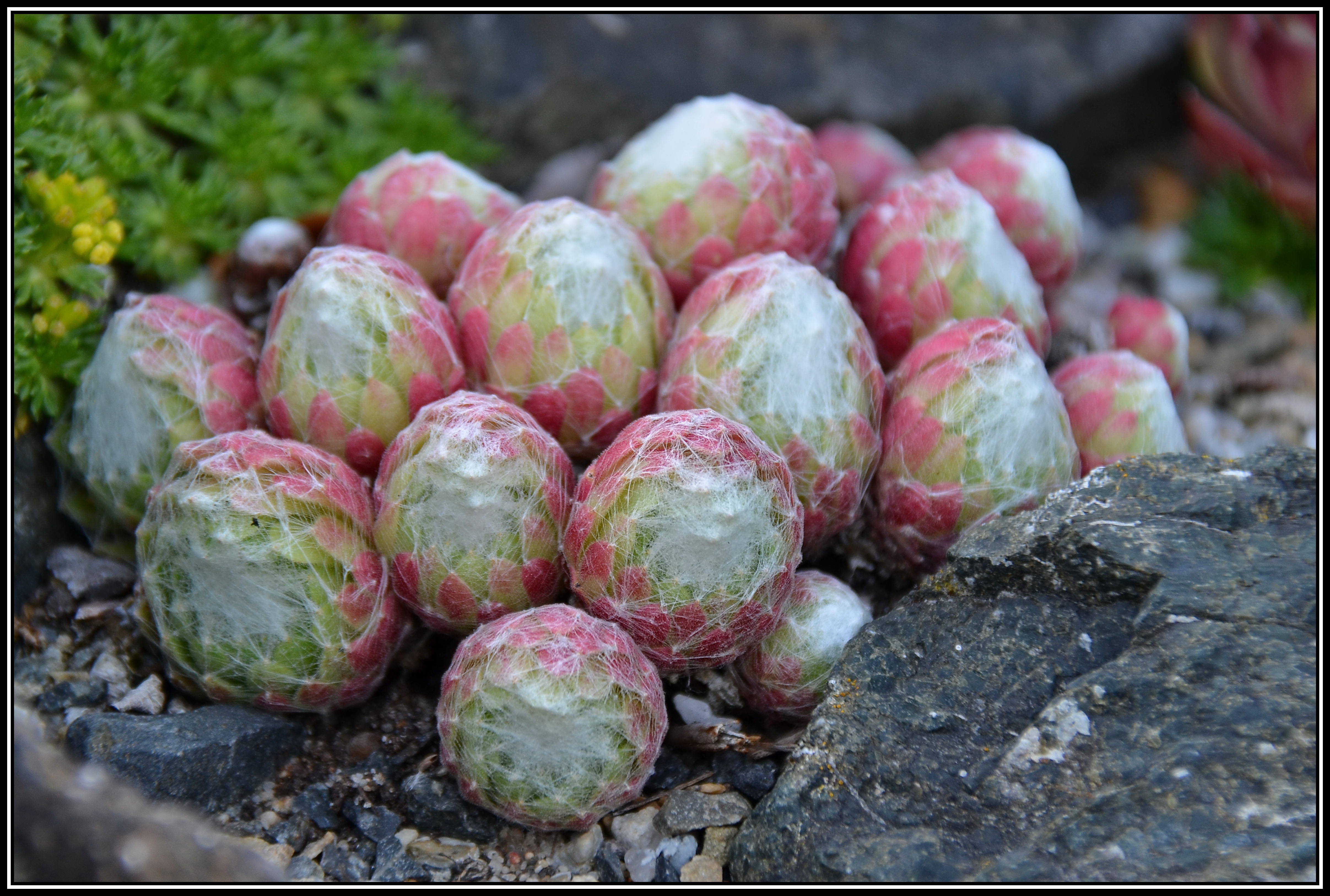 Der Spinnweb-Hauswurz schützt sich mit seiner Behaarung vor zu starker Sonneneinstrahlung und somit vor übermäßiger Verdunstung. Diese Hybride hier hat zudem die Einzelblätter der Blattrosette kugelförmig zusammengezogen, was ihr eine ungewöhnliche Erscheinungsform verleiht.